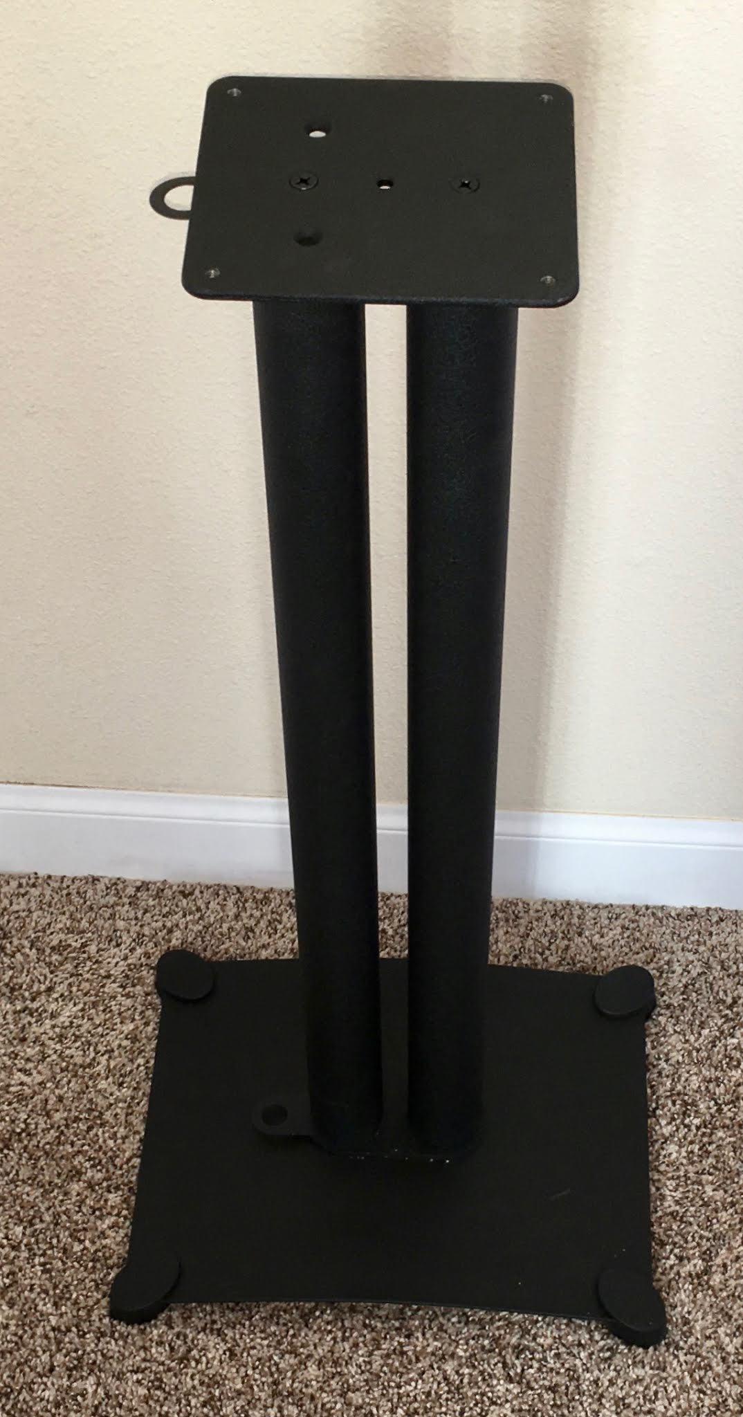 The AudioEngine website recommends some speaker stands for their speakers, and they suggest the various SANUS stands. Presumably, this means their audio engineers are happy enough with the quality of the stands - and, conveniently, the stands are drilled for a hold down bolt that sinks into the base of the speakers! One of the absolute requirements of any speaker stand (for us) is that it tolerate a small child pulling himself up on them, and that means that the speakers need to be secured, not just sitting on top. It also means that I need to secure the stands to the floor at some point, and I’ve got some ideas for this set.