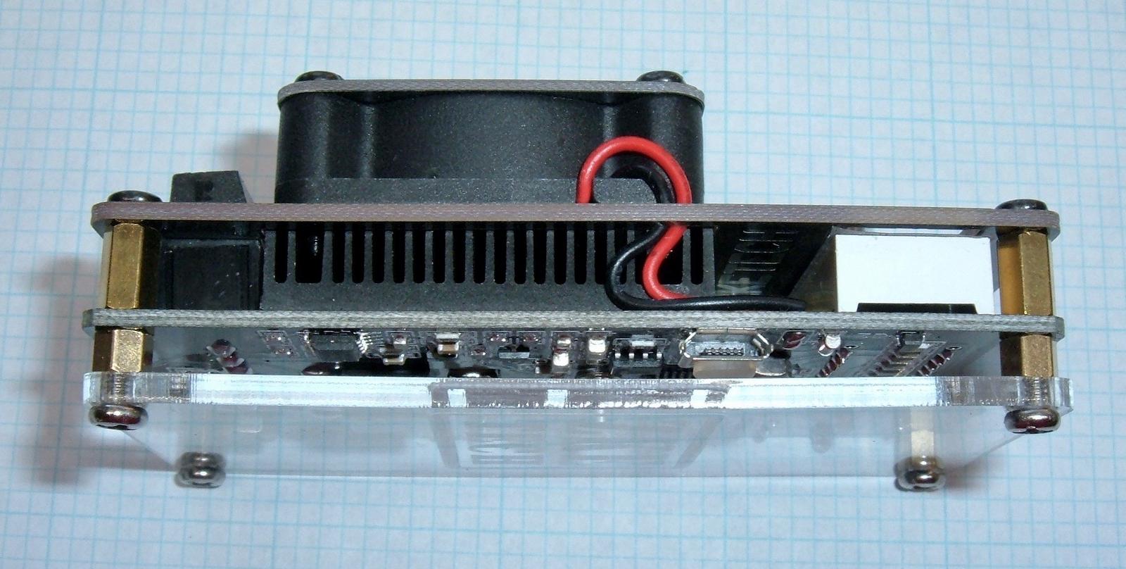 Power for the unit (and serial communication, if you care to use it with a computer) are provided by a micro USB terminal on the side. You can see the heatsink and fan stack here - it’s a bit less than I might use for a similar system, but it seems to work fine in practice. There’s also a little rubber bumper on top of the micro-USB port that helps prevent stressing the port - it’s a nice touch.