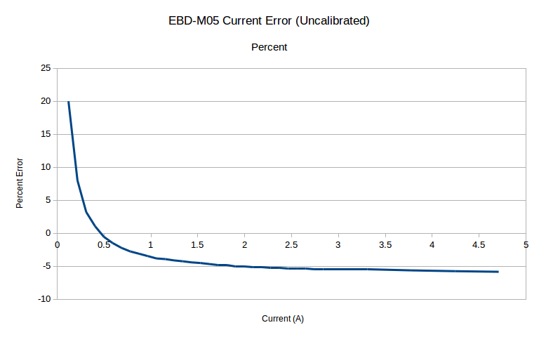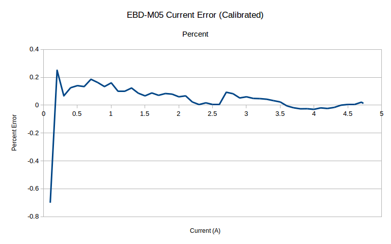 Current, out of the box, is another story. The low current offsets show up again, but it’s still really, really bad out of the box. It settles in at -5%, which is far, far outside the 0.5% spec it should be capable of.