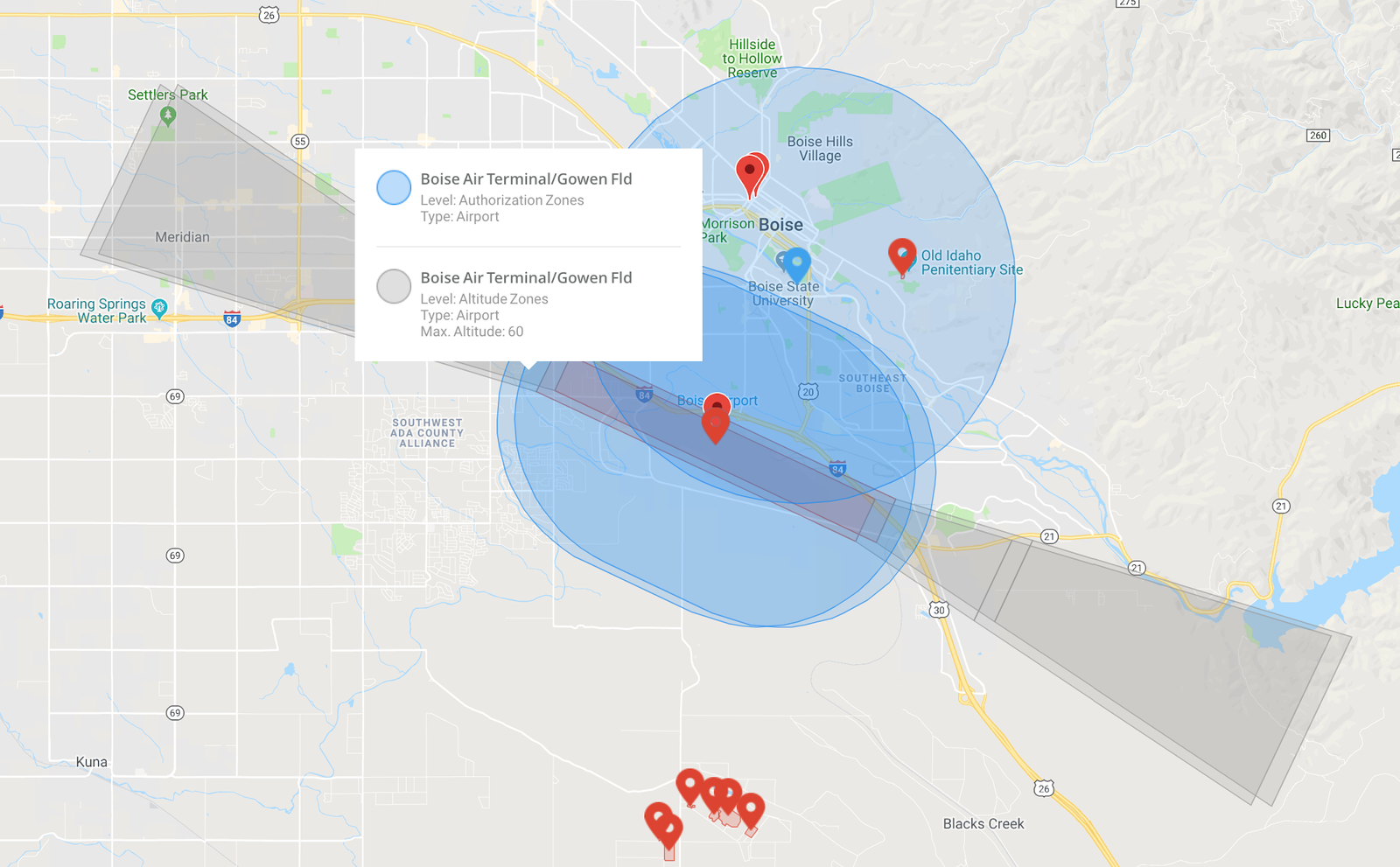 I’m somewhat more of a fan of what DJI has done (quite recently, actually) with the Boise airport (KBOI). The restriction zone is far more limited, but they also have altitude restrictions protecting the approach and departure paths. This is, IMO, quite reasonable. If you’re curious, the red spots at the bottom are a prison area - smuggling stuff into and out of prisons with drones is apparently quite the big business. The blue region to the north is an upcoming TFR for a bowl game.