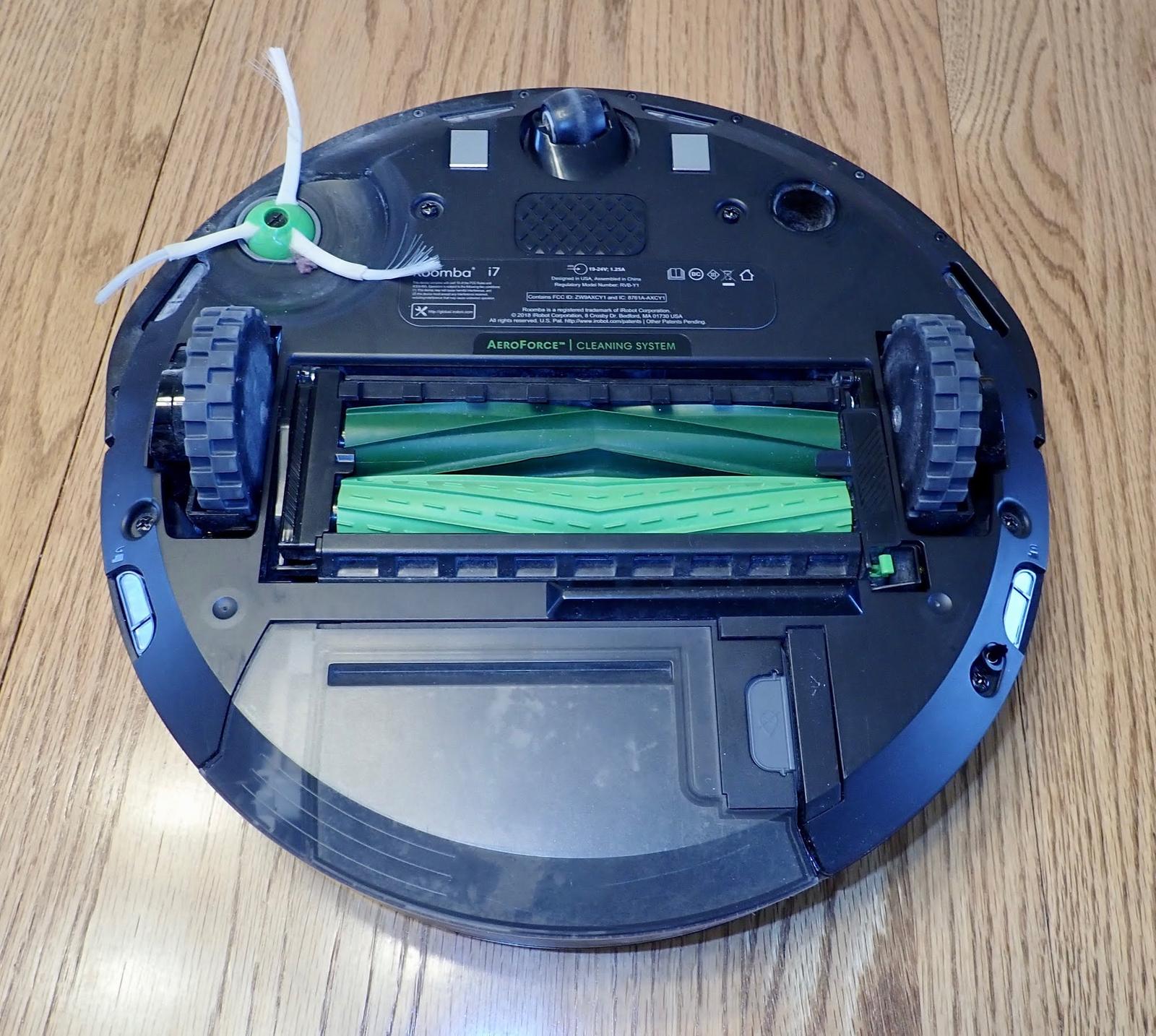 A Roomba still can’t handle stairs, though. To prevent falling down a flight of stairs, there are cliff sensors around the perimeter (you can see two behind the main wheels, two in front, and two on either side of the nosewheel). In earlier versions, these also tended to prevent a Roomba from cleaning a black carpet, but supposedly that’s fixed in the i7 (I don’t have any black carpet, so I haven’t had a chance to test).