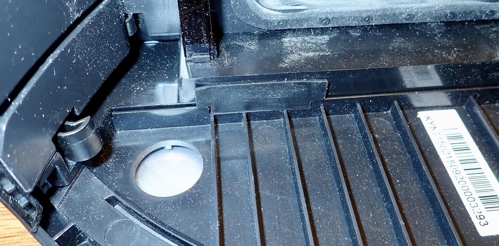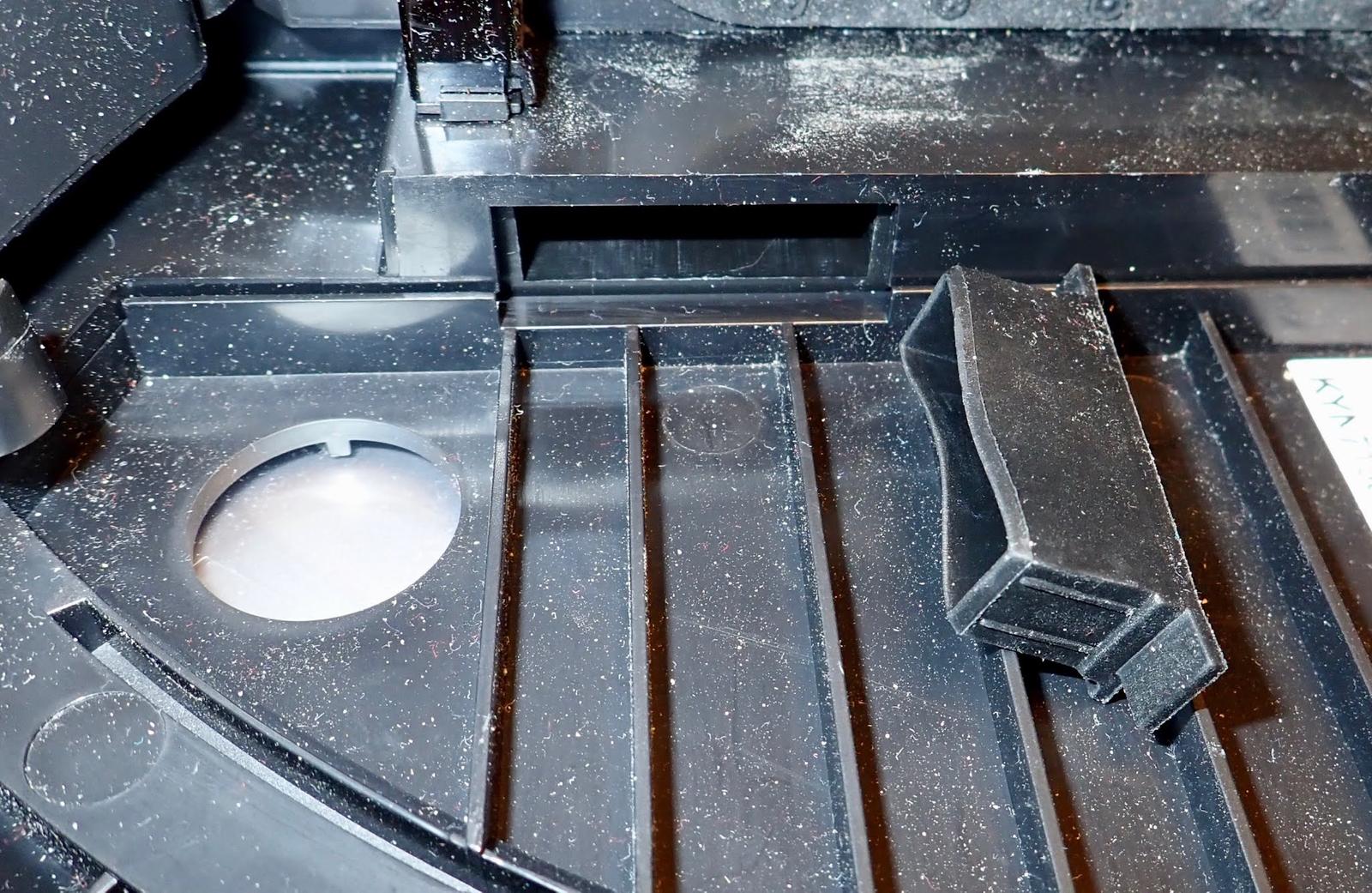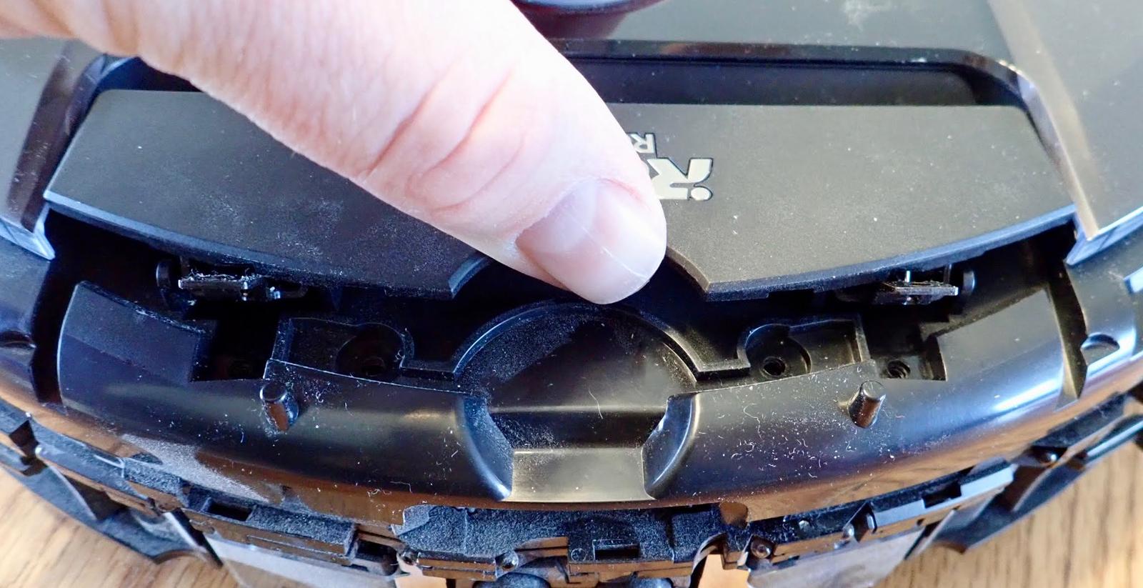 If you look carefully, you’ll see a 45 degree angled bit of plastic in the center. This is part of the “bin full sensor” system - clean this every time you empty the bin or you’ll confuse the robot.