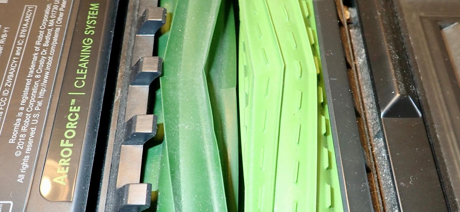 Zooming in on the extractors, they’re two different textures, and they don’t quite mesh - but they come very close. You’d have to ask a Roomba engineer for details on how they work, but they seem to do a very good job of getting stuff off a variety of surfaces. The guide teeth on the front presumably serve to let the vacuum head drift to the proper height, and I have no idea why the raised lip on the back only extends across half the width.