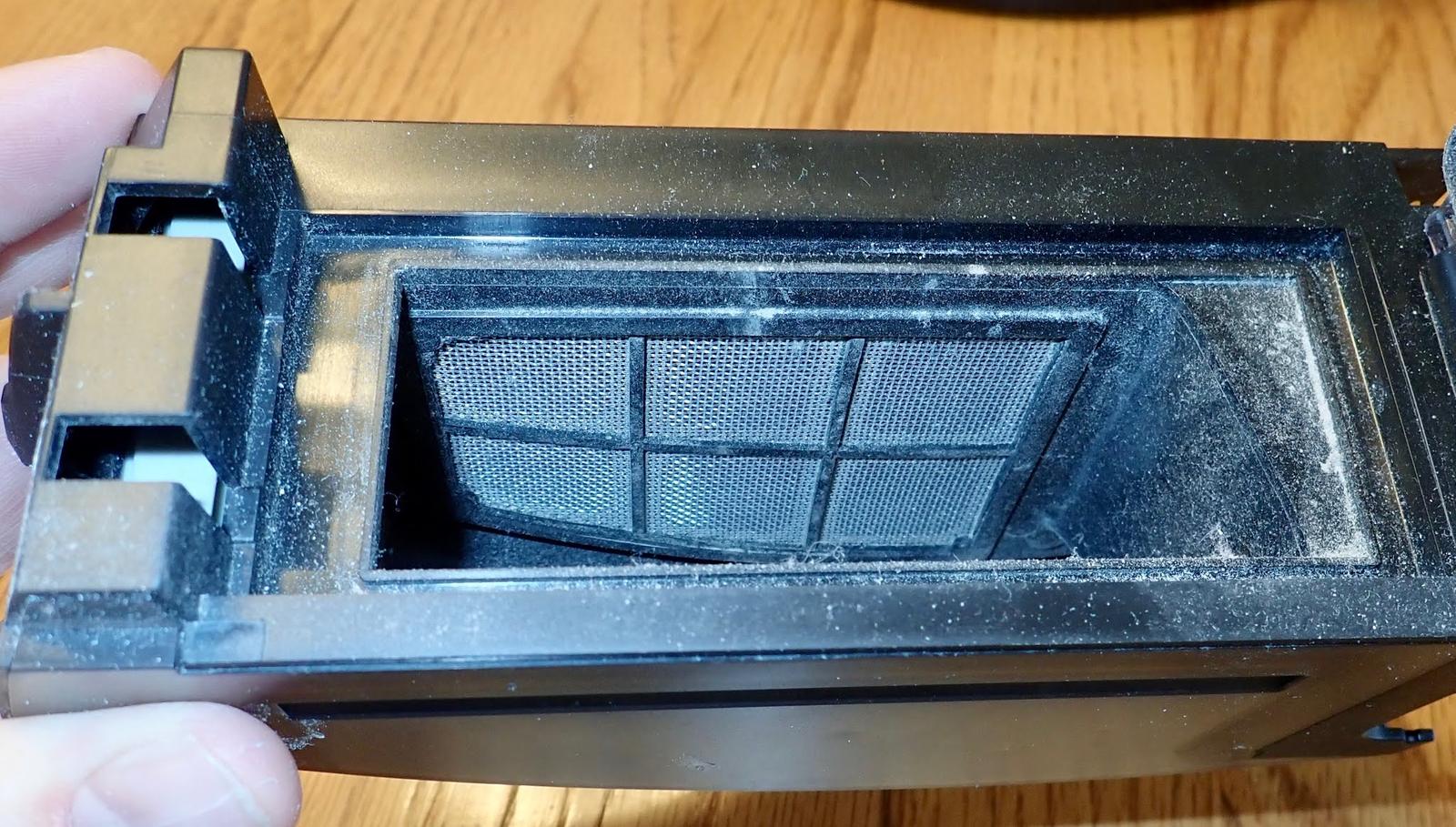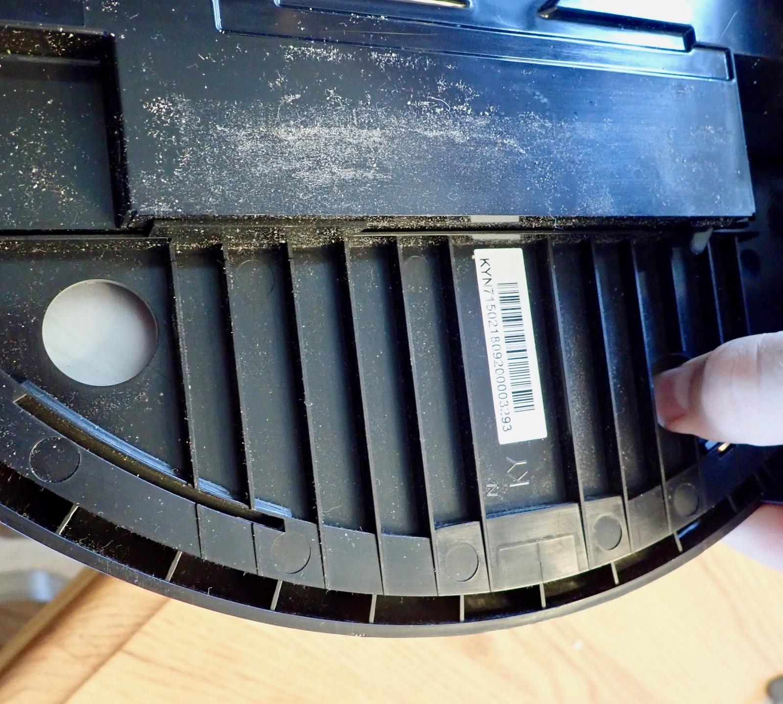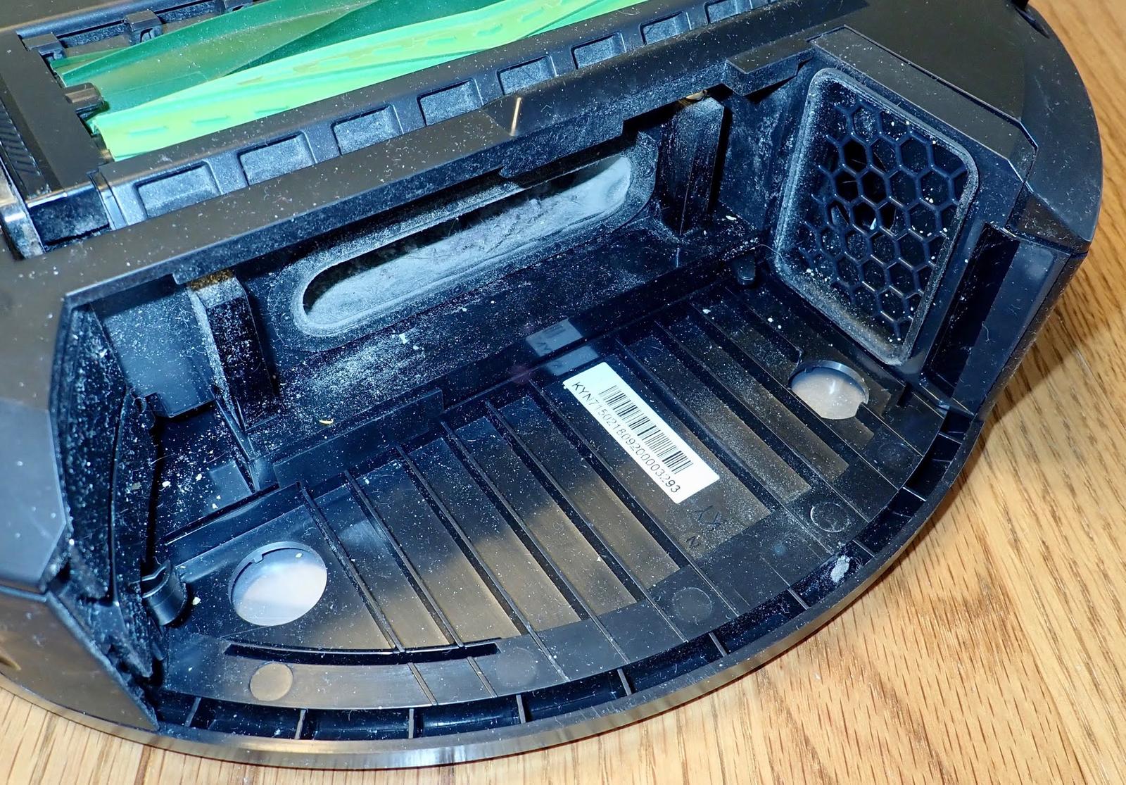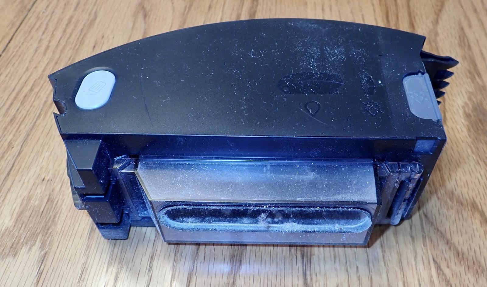 Press the big button on the back of the Roomba, and the dust bin pops out. Unlike earlier units, the blower motor is in the chassis, not the dust bin. This means you can clean the dust bin out in the sink (once you remove the filter). Icons on the top indicate that you shouldn’t get the filter wet, but the rest is water-safe. Cleaning it out in the sink every now and then is a good idea, because dust lurks in all sorts of weird places in here, and the static buildup is impressive.