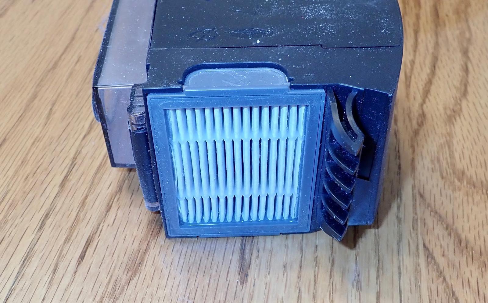 One of the consumables on a Roomba is the paper filter. It tucks into the end of the dust bin and is just like the filter in a normal vacuum. Some places say it’s a HEPA filter, some say “high efficiency” - I’m not sure what sort of filter it actually is, but it does a perfectly good job of filtering out dust. When you empty the bin, tap this (dirty side down!) in the trash can a few times to knock off the debris. You could hit it with an air hose from the clean side to knock more gunk out every now and then, if you were inclined to avoid replacing it as often. I’m not sure what the service life is - I suppose I’ll find out when the robot stops sucking up as much dirt.