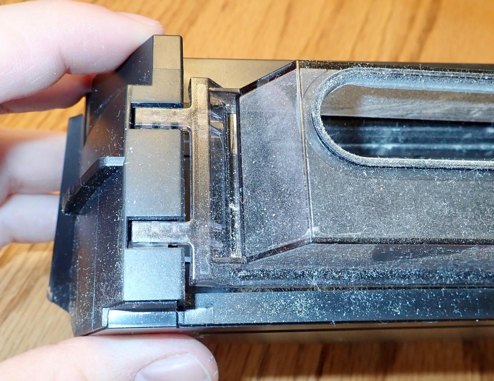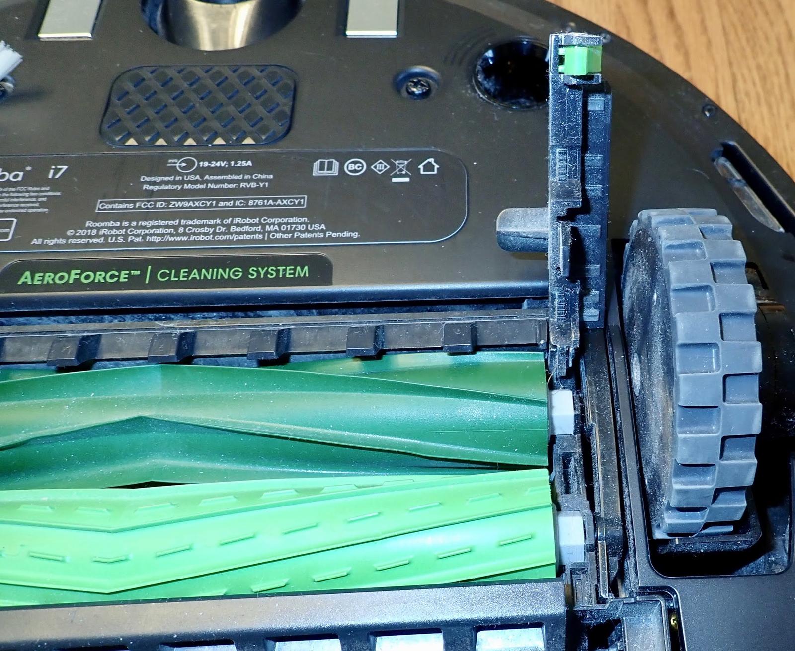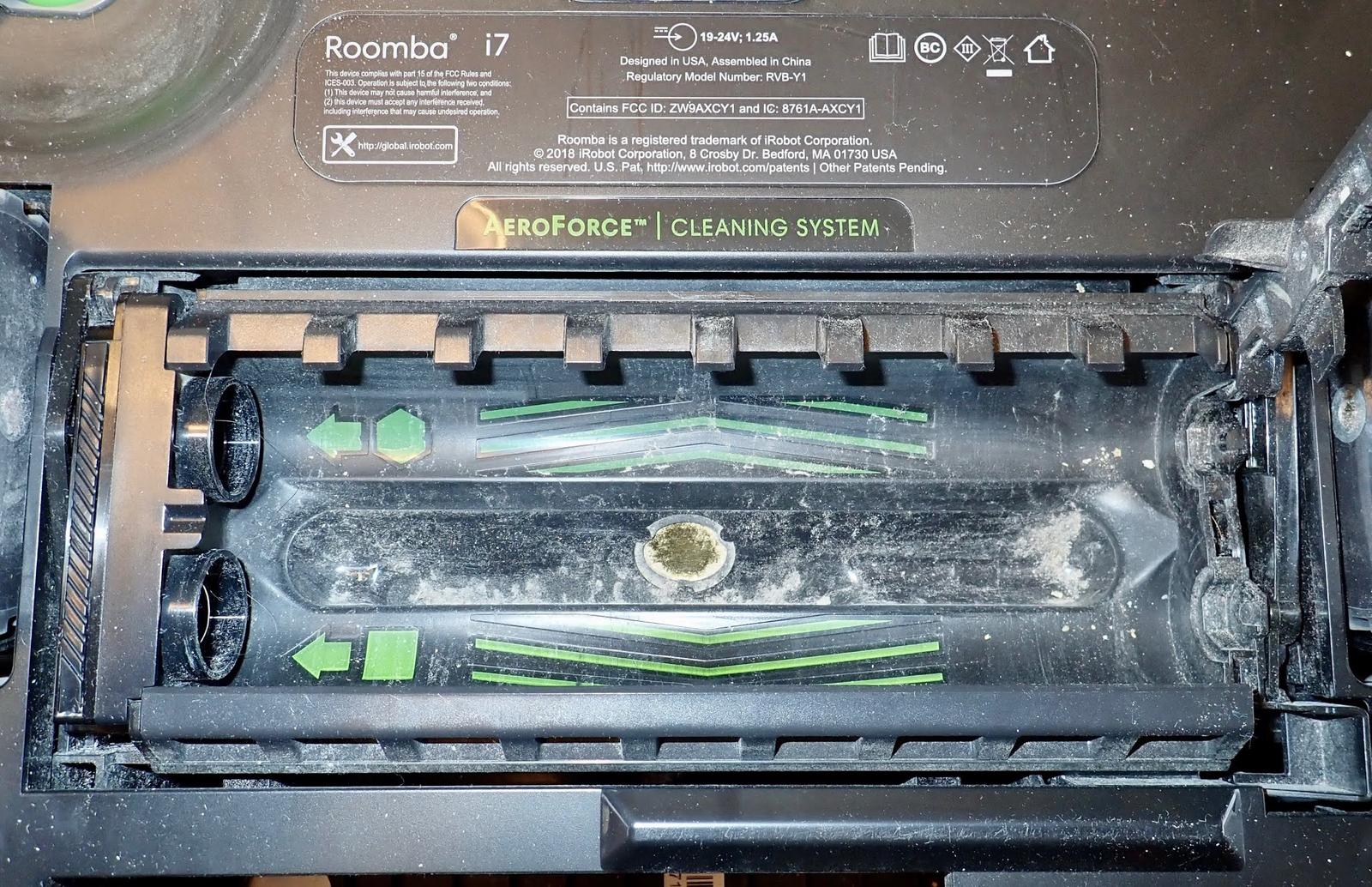 The other half of that system is on the Roomba - look for the two black bars on either side of the vacuum opening. Clean those off as well. I assume they’re also infrared emitters, and that the plastic prism bounces the signal across the opening. When too much stuff builds up, the signal is blocked, and the robot decides the bin is full. You can select the behavior at this point - either stop and wait to be cleaned out, or keep cleaning (useful for things like fluffy pet hair that can just keep packing in). The i7+ will head back to the base and suck all the stuff out, if you’ve opted to spend the extra on that particular setup, though I don’t believe it can clean the sensors.