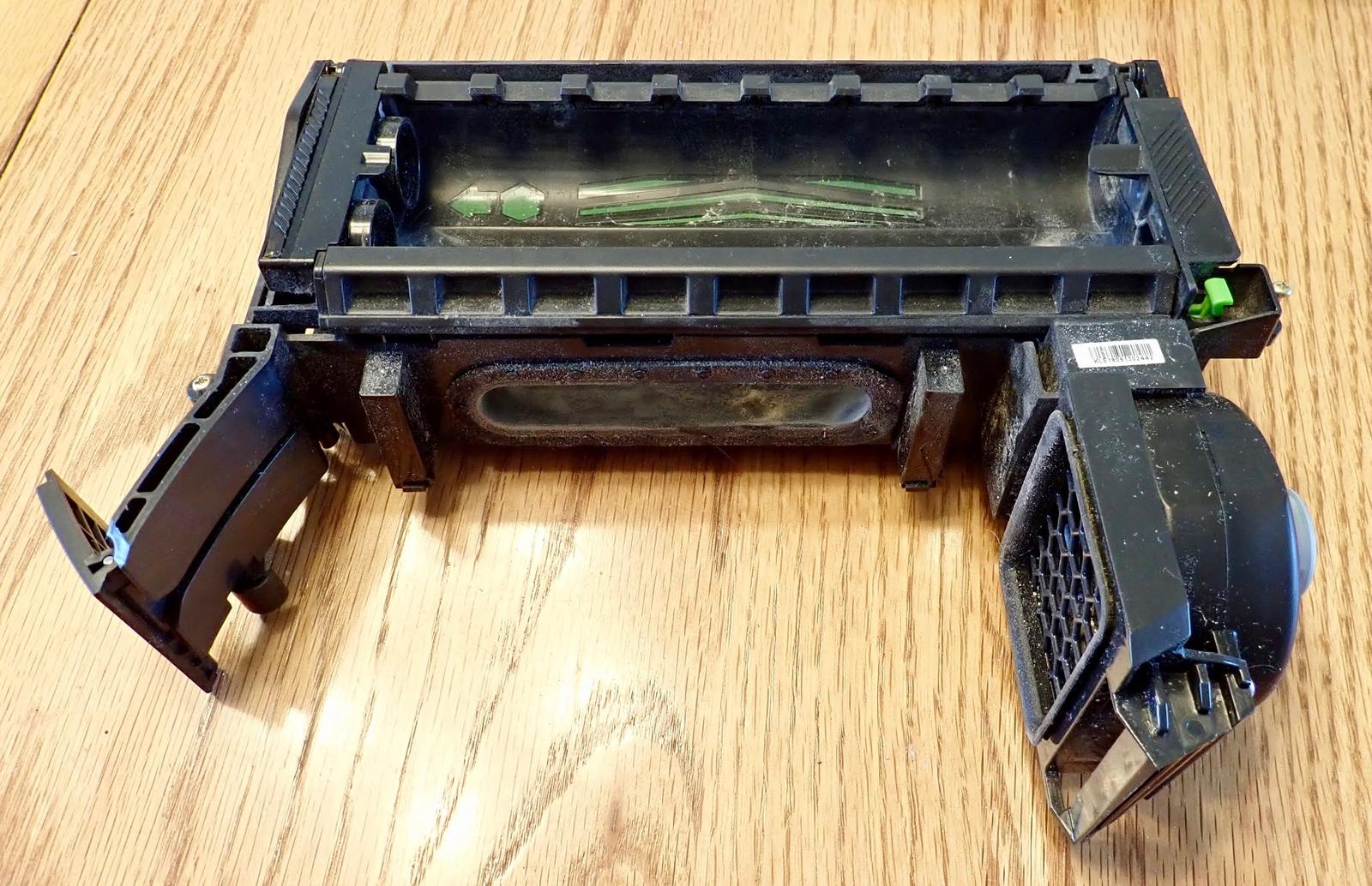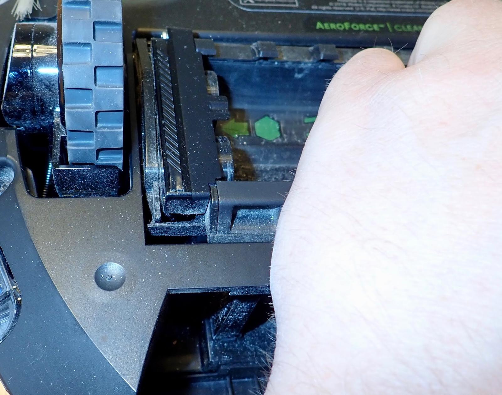 There’s a nice handle at the front of the robot, and I didn’t even realize it was a handle until I was taking it apart. Remove the screws holding it in, push the handle back, grab the now-exposed tabs, and pull forward. The whole thing comes out.
