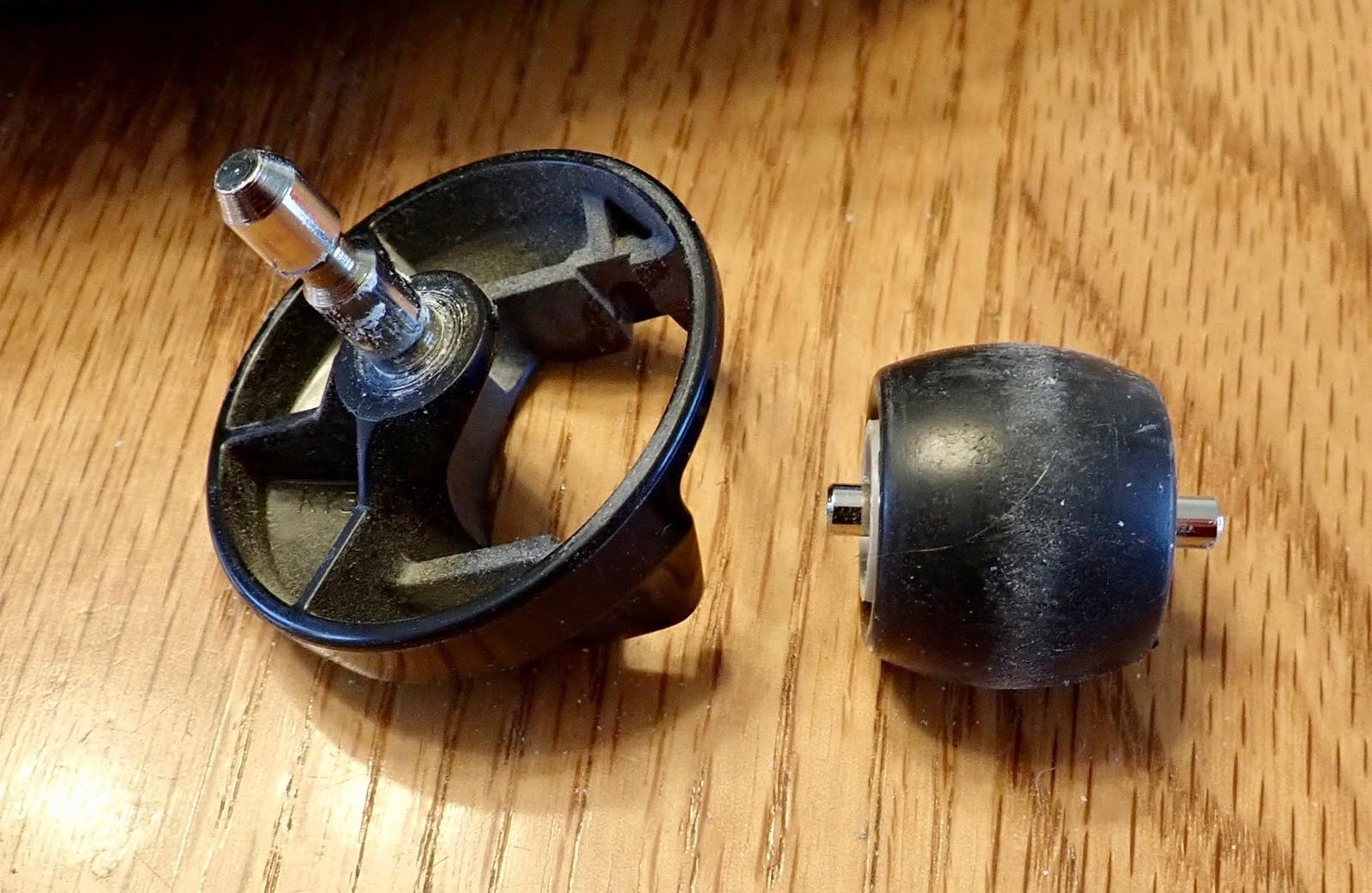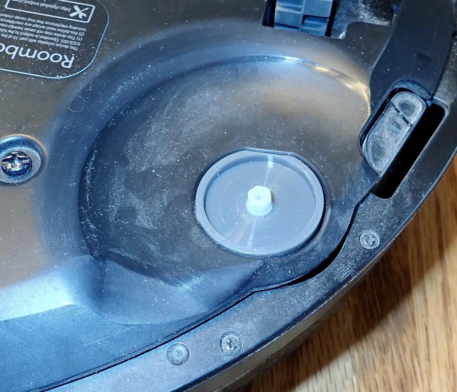 The front wheel caster just pulls out, and the wheel pushes out. It spins on a shaft, and will probably wear out at some point as well, though it’s not a highly stressed component. I’ve seen some modifications that cut a groove in the wheel and put a rubber O-ring in for reducing the chances of scuffing a wood floor, but the wheel is soft enough that I’m not too worried about it on our laminate (also, two kids are far harder on it than a Roomba).