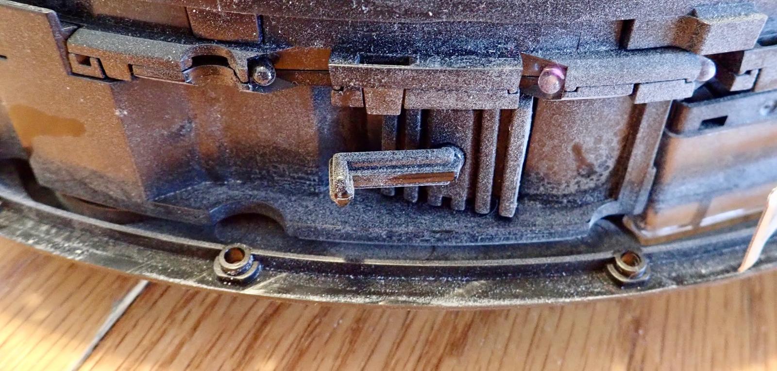 To remove the bottom plate, the spinner brush has to come off - you can’t get the plate off otherwise. This is a single screw, and pulling a bit harder than I expected. A hexagonal shaft transmits the rotational energy from a motor to the sweeper.