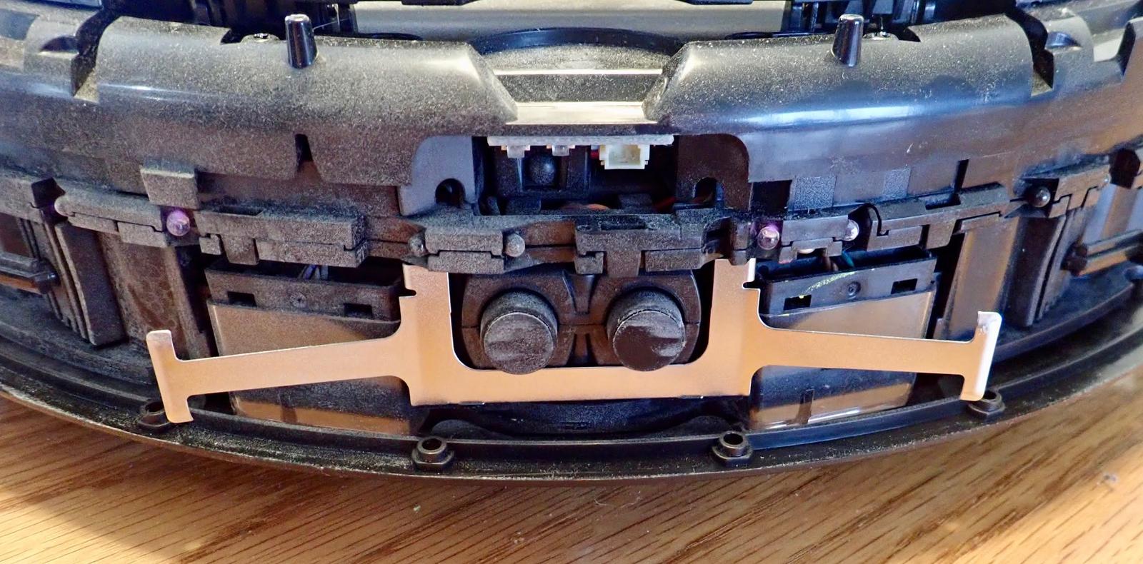 Under the bumper, some metal springs keep it pushed forward unless impacting something. The two rubber circles appear to just be bump stops - I don’t think they’re sensors of any form. You can see the IR emitter and receiver pairs starting to arc around. They’re the little clear and black LED lumps sticking out, and there are a lot!