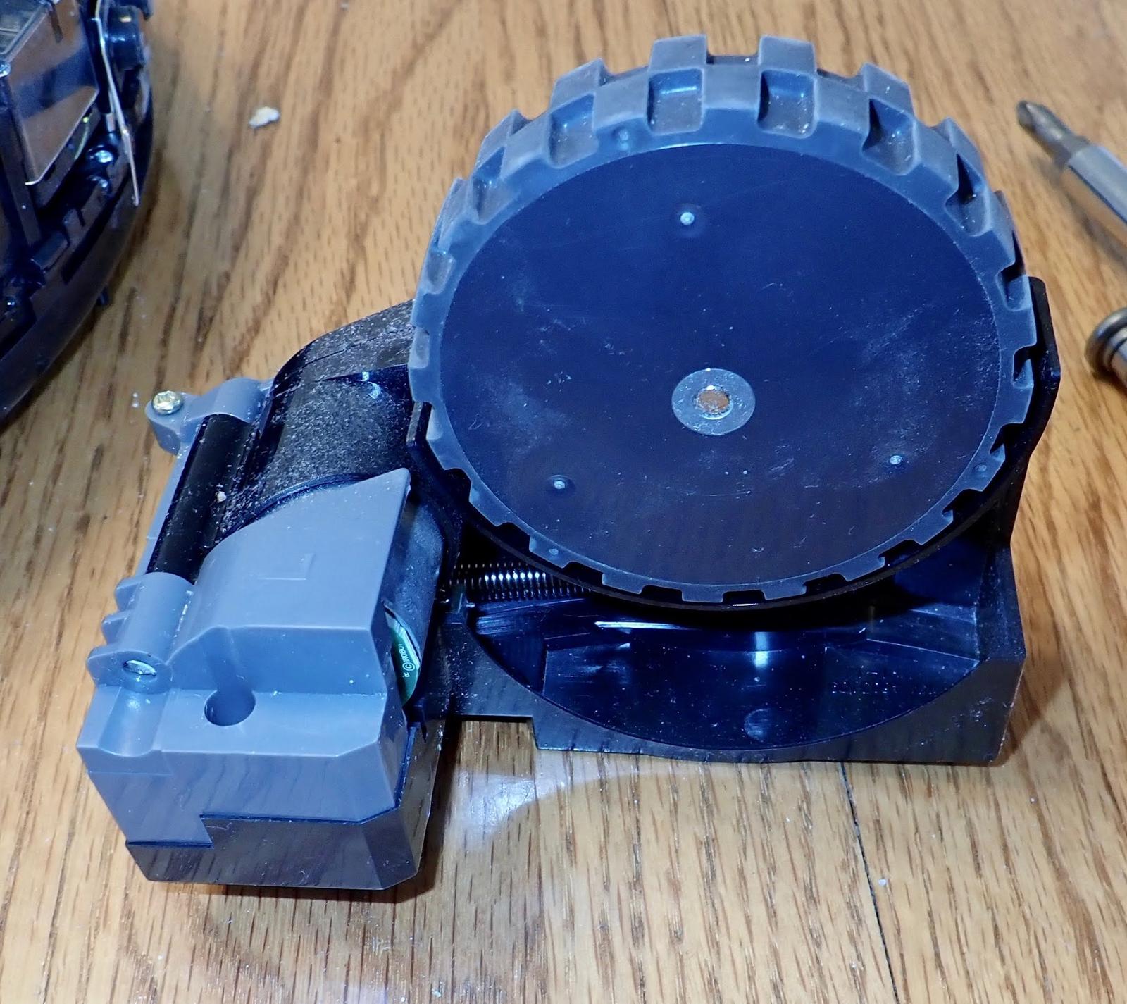 Remove two screws, and a wheel module pulls out. These are apparently almost, but not completely, identical to the previous generations. It’s a motor, a geartrain, and a suspension spring. If you feel the need to open the wheels up further, they come apart completely for cleaning or replacement of parts, if you can find the gears.