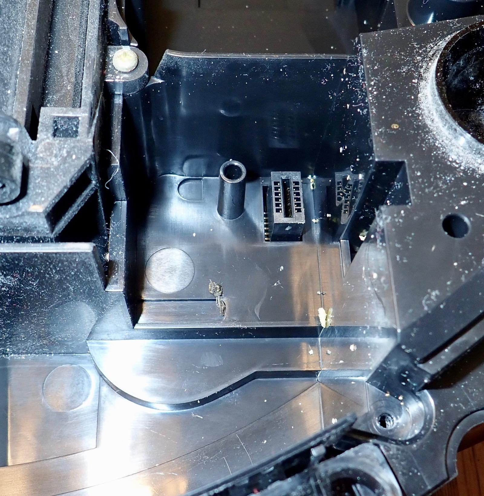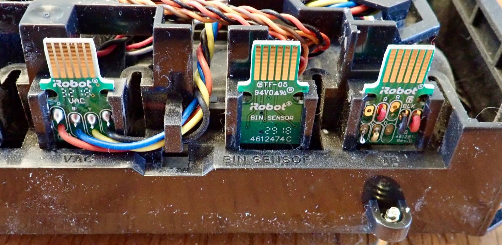 Three connectors, three motors. The left connector is for the vacuum motor, the center connection is helpfully labeled “bin sensor,” and the right connector, which isn’t labeled, should run the extractor motor. It looks almost like a prototype connector to me.