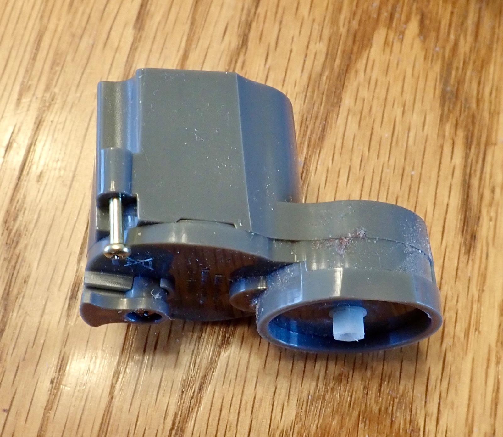 The other end contains the pivots, made of a metal pin with some plastic springs that ride against it. I expect these will wear out eventually and be cause for replacing the extractors (in addition to the splines wearing down).