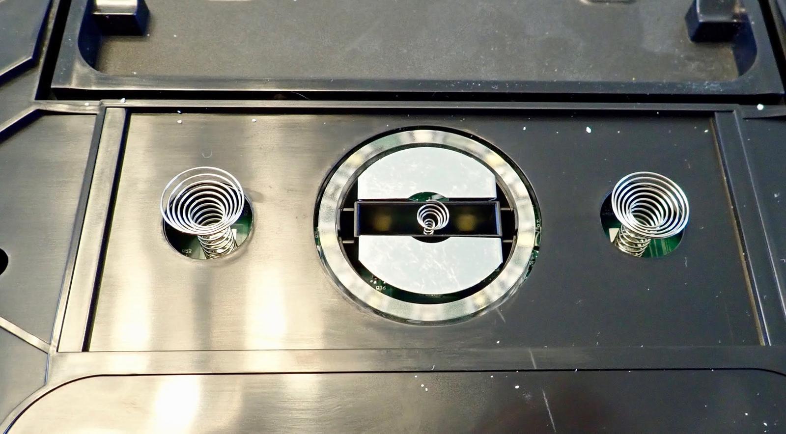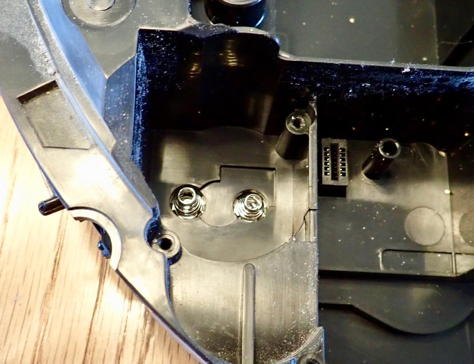 Well, hello there to you too! The capacitive buttons are handled by coiled springs that press up against the bottom of the plastic shell. It’s not a style I’ve seen anywhere - I expected some wires connecting to an interface plate. Neat! The LED ring is visible around the outside of the center button.