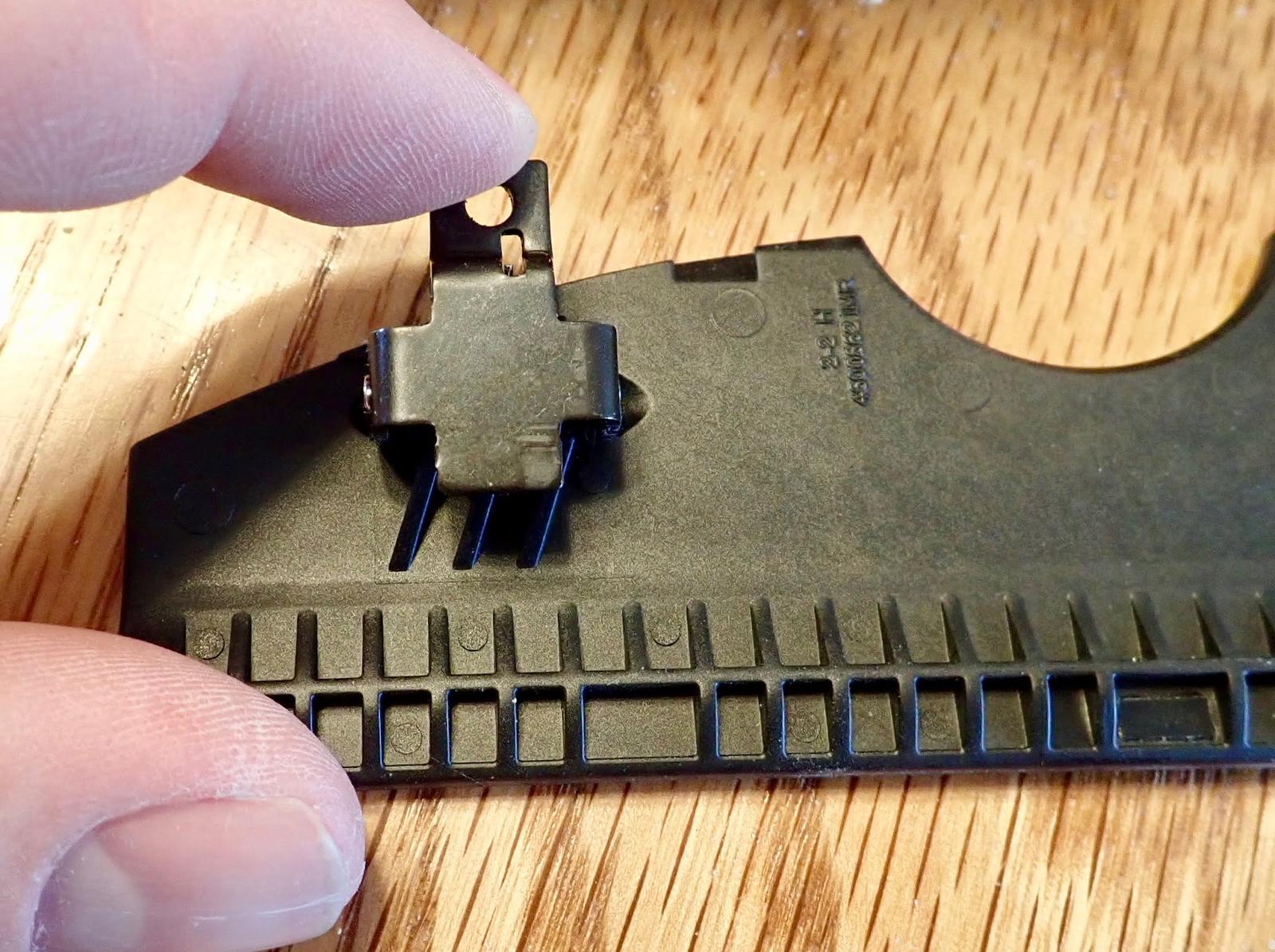 The lower tabs here fit into some grooves in the case. To reinstall the handle, hold both of these tabs with the front edge facing up, push the handle back in place, then let the tabs rock down and screw them in. You have to get both at the same time or it won’t sit right. It sounds trickier than it is.