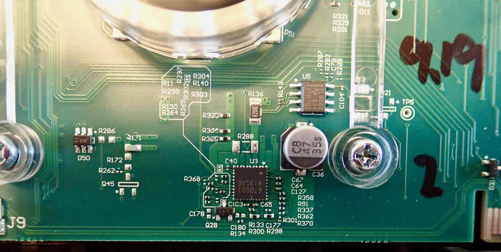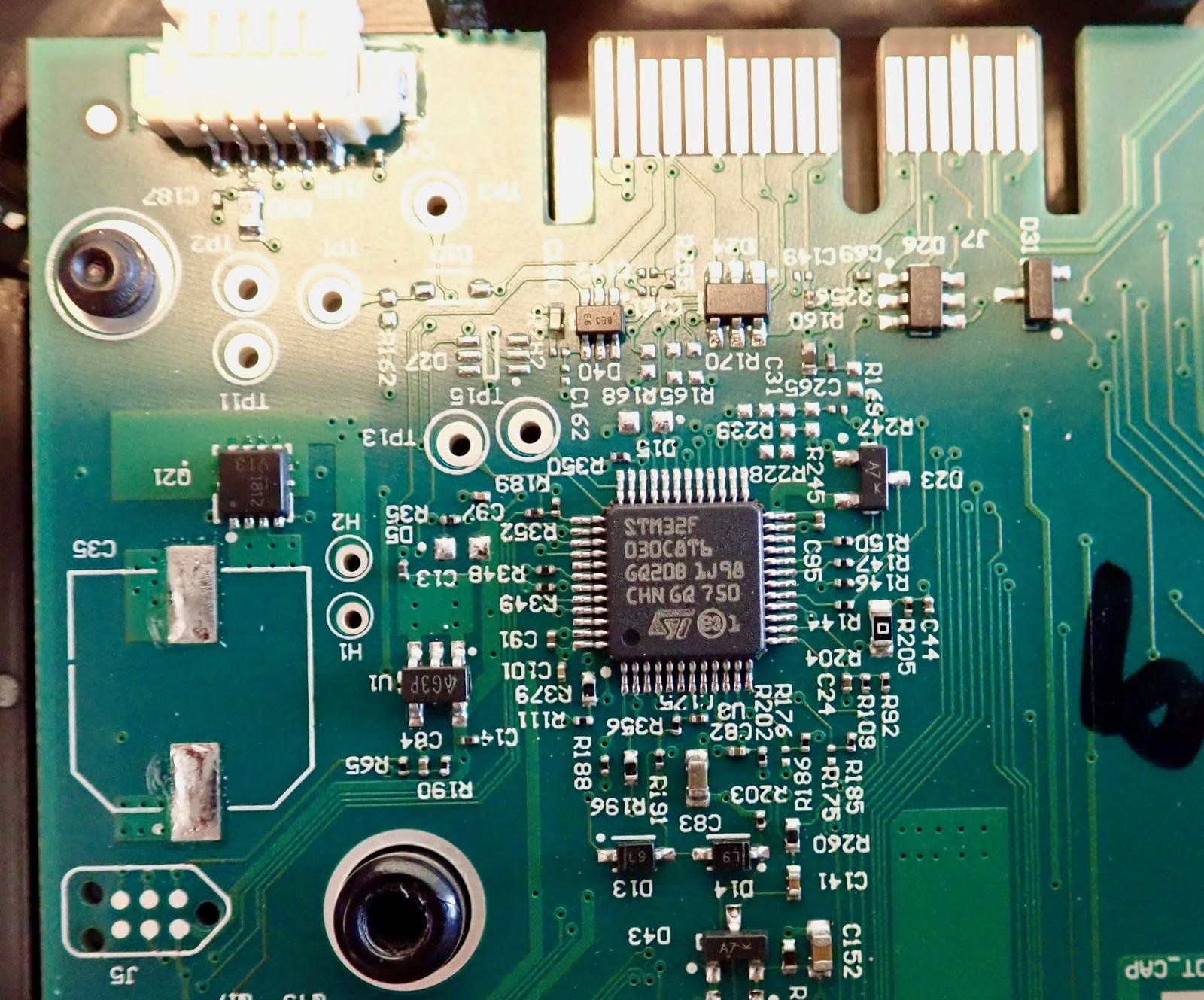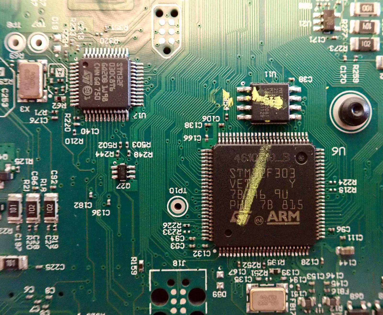The largest chip on the board is a STM32F303VET6 - a 72MHz, 32-bit ARM chip. This is likely the main CPU, handling the bulk of the operation, but there are plenty of additional little STM32F chips scattered around the board.