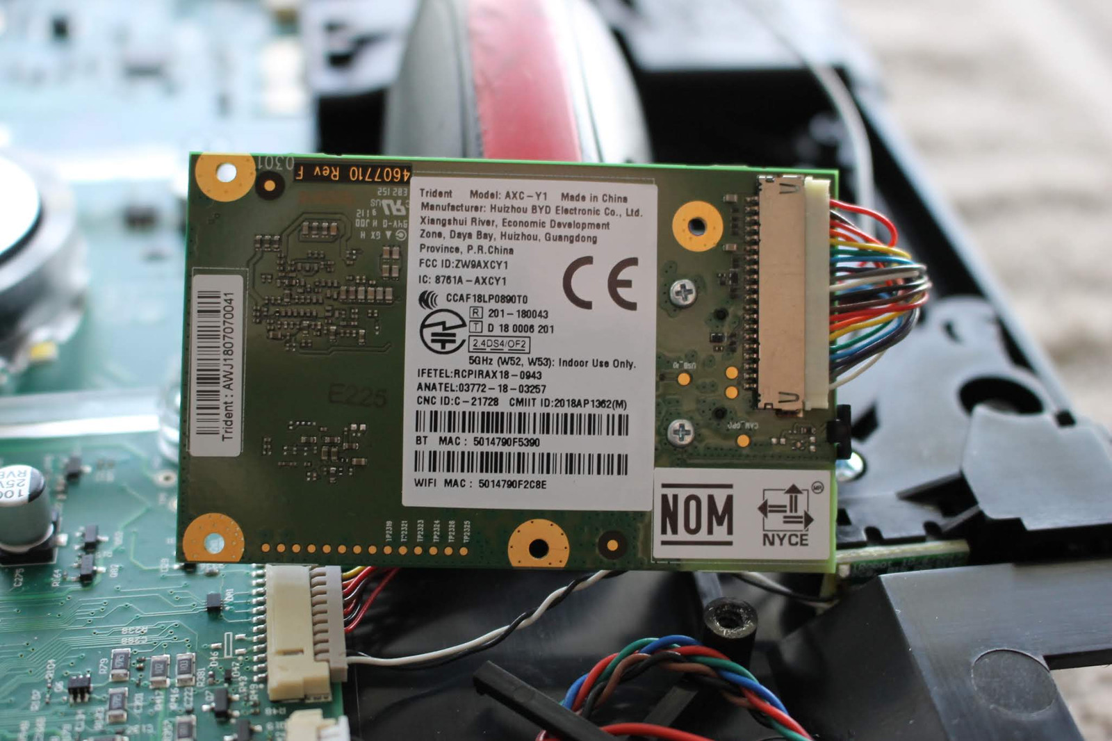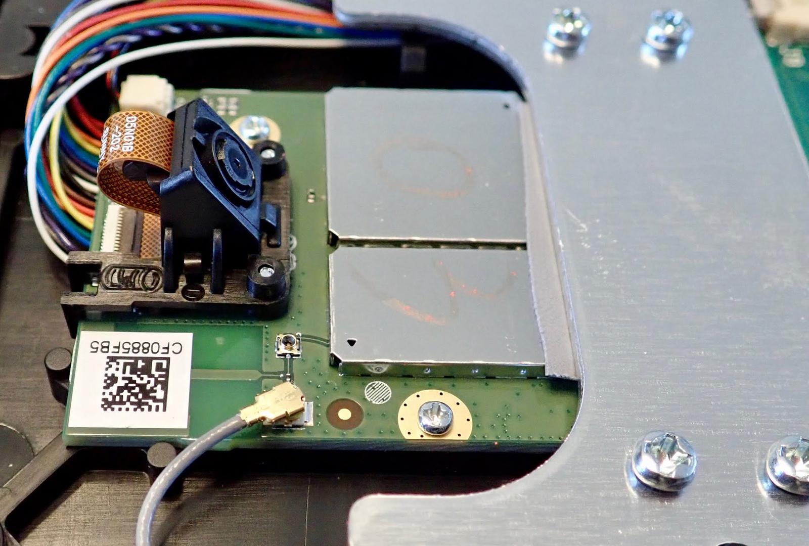Behind the main board, there’s a wireless and camera board. The metal shrouds are commonly found on high frequency gizmos, and this unit supports both 2.4GHz and 5GHz wireless, as well as Bluetooth. Interestingly, this board does have a heatsink - the large metal piece across the top has a piece of thermal tape under it, so it’s serving to cool the wireless engines. You can see what looks like a typical wireless antenna cable heading off to the bottom, with an unused antenna port above it. Plus, perhaps, a PCB antenna under the sticker to the left.
