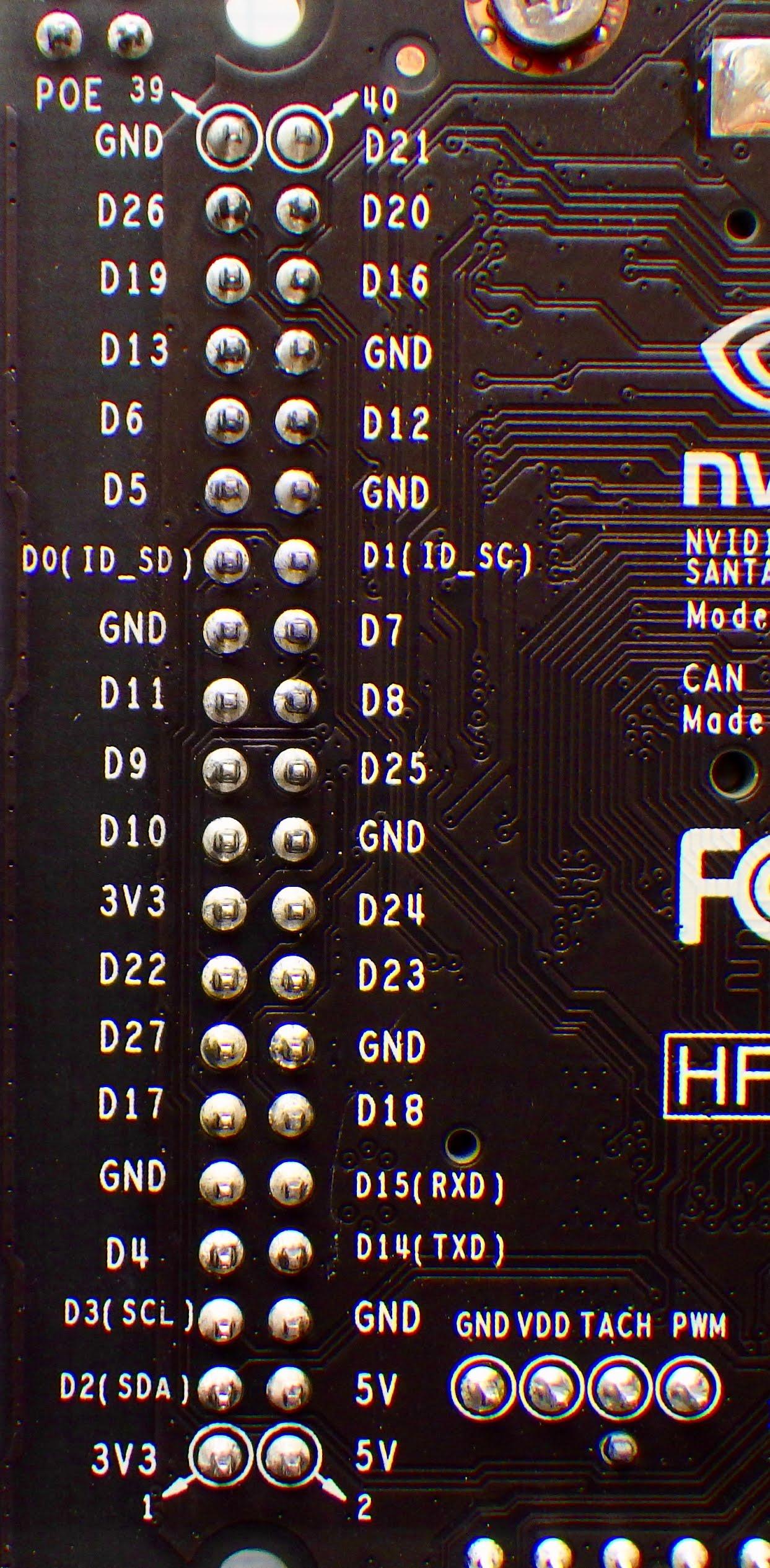 From the Raspberry Pi site, this is the Pi’s 40 pin layout. The voltage and ground pins are all identical, and while the numbers are different, nVidia is labeling the pin ID, and the Raspberry Pi’s chart is labeled with the actual chip GPIO number at each point. It’s easy to translate between them.