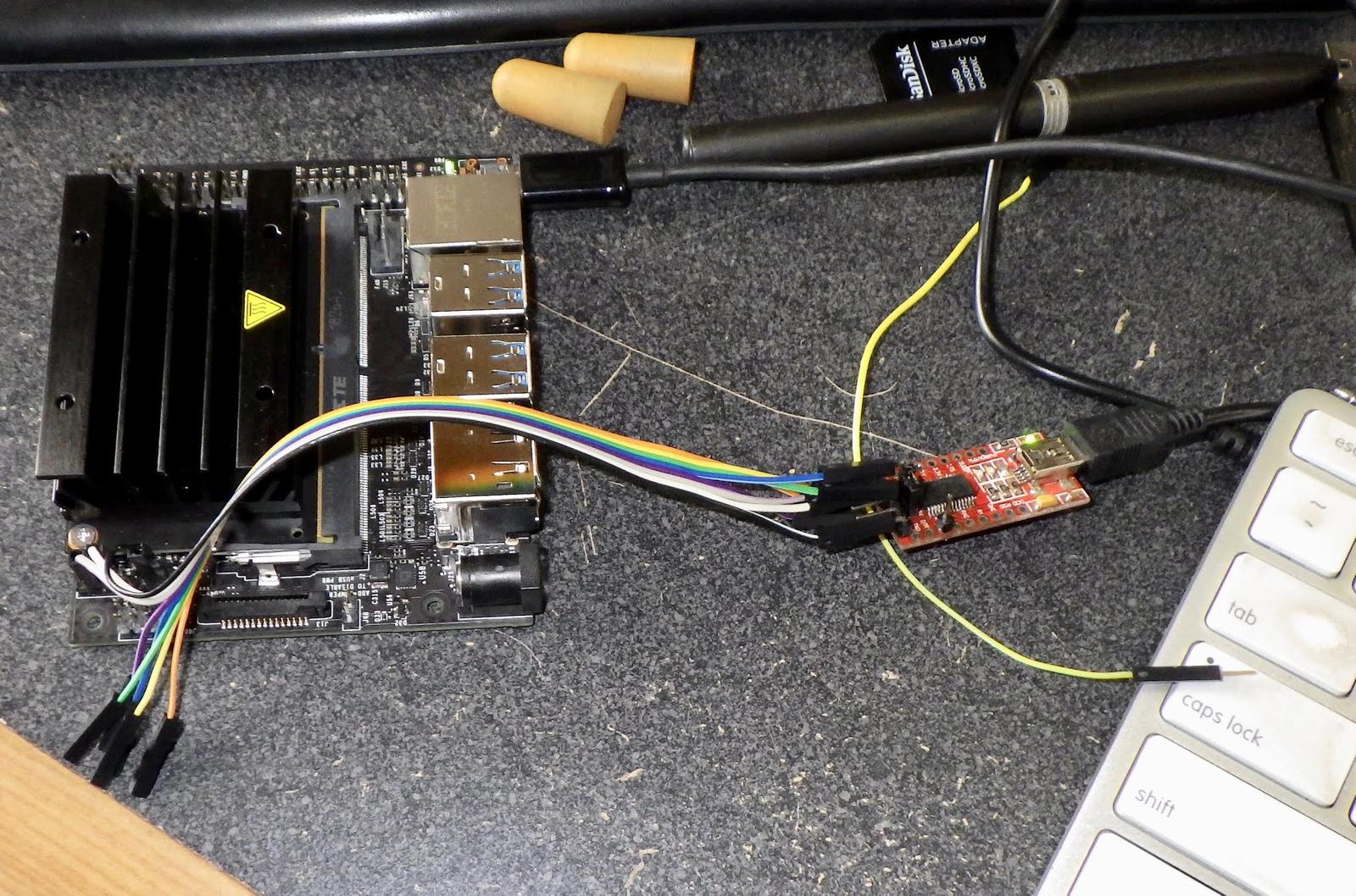 If you’re debugging the device at all, or (say) screwing around with kernels, a serial interface is most useful. The dev board breaks out the serial port for you. It’s regular TTL serial, and while I’m not sure what voltage it runs at, I’d run the adapter 3.3V to be safe. This isn’t a 5V board. If all you’re doing is watching the output, of course, it doesn’t matter.