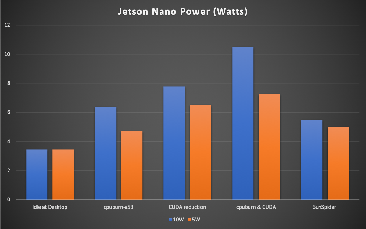 I did some analysis of the Nano power use with my MingHe DPS6015A. With the USB3 SSD attached (worth about 0.5W), I found that the 10W mode obeyed the limit fairly well (the max I saw was 10.5W, and if you subtract the SSD, it’s right at 10W), but the 5W mode definitely exceeded 5W by a good bit every now and then. I’d guess the 5W limit is for the card only, and the board explains the extra power draw, but if you really need to cap it to 5W, be careful.