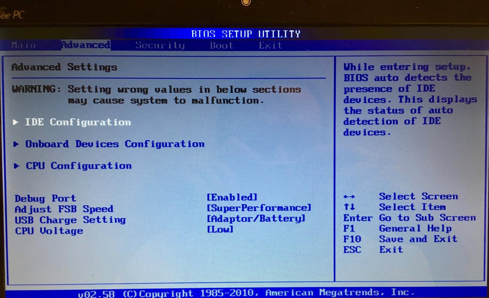 While you’re in the BIOS, if you want to find some hidden options, try Ctrl-F1. It opens up a few more settings on the Advanced tab. You can select the front side bus speed and CPU voltage! Does it work? I actually don’t know. The setting about charging while turned off doesn’t seem to do anything, so I’m not sure the others make any difference either.