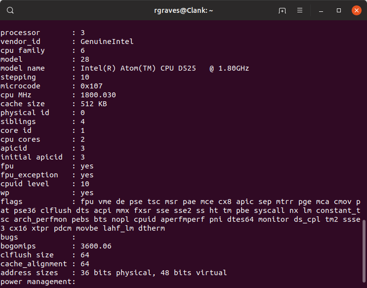 If you’ve kept up with what Linus calls “yet another speculative hardware engineering trainwreck” when he’s being overly kind, this machine has that covered as well. It’s running an old Atom D525 chip, which is a genuinely odd little Intel processor. It doesn’t have speculative execution, it doesn’t run micro-ops like the mainline Intel chips, but it does have 64-bit support - and hyperthreading. It’s an odd little dead end chip, as far as I can tell, but it seems immune to just about all the nonsense that Intel has been up to lately. Even Linux says it doesn’t have bugs! Of course, it doesn’t have power management either…