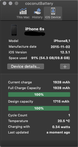 After my first battery calibration cycle (which took 4 days in low power mode), I checked the capacity with Coconut Battery. That’s 12% more capacity than rated on the iFixit battery - no complaints here so far!