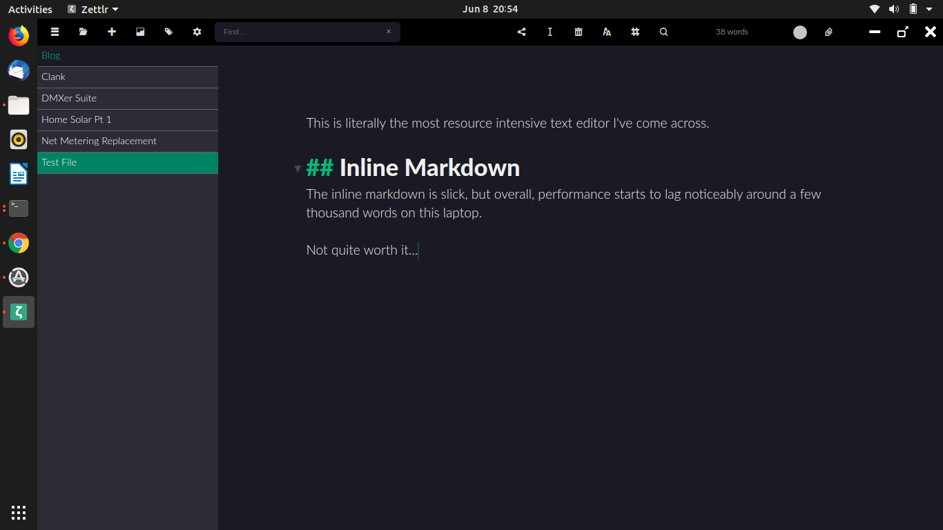 It runs Netbeans just fine, it runs a standard compiler stack just fine, it runs the Arduino IDE, and it makes a halfway nice little writing laptop as well. I’m been playing around with Zettlr, which is quite possibly one of the most resource-intensive text editors I’ve ever met. It looked nice, but it’s an Electron app, which means it runs a browser under the hood, and the CPU use while typing is comically high for a text editor. It looks nice, though!