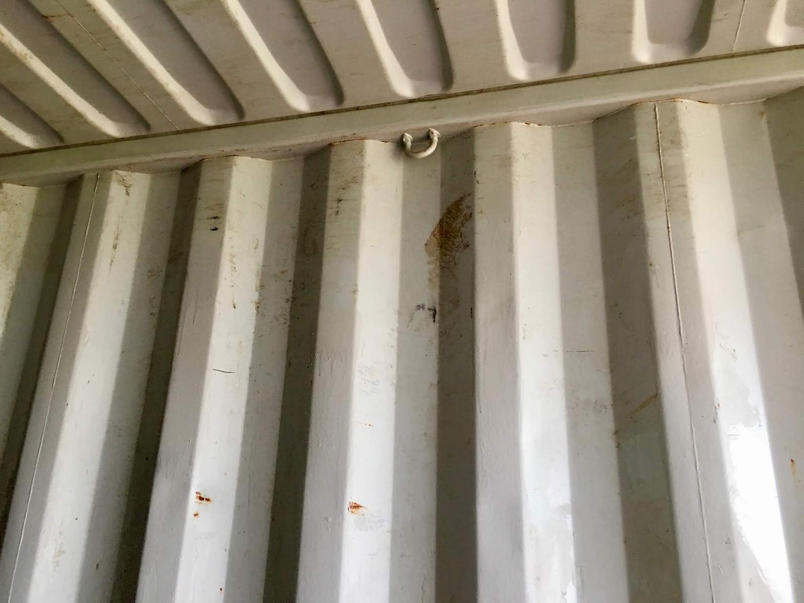 Shipping containers typically have hooks welded across the top. These are intended as tiedowns for whatever cargo happens to be in them, but they’re large, metal, strong, and perfectly suited to hanging shelves as well. What they aren’t is standardized - so don’t assume that because one container has certain dimensions and hook placement, another will be identical.