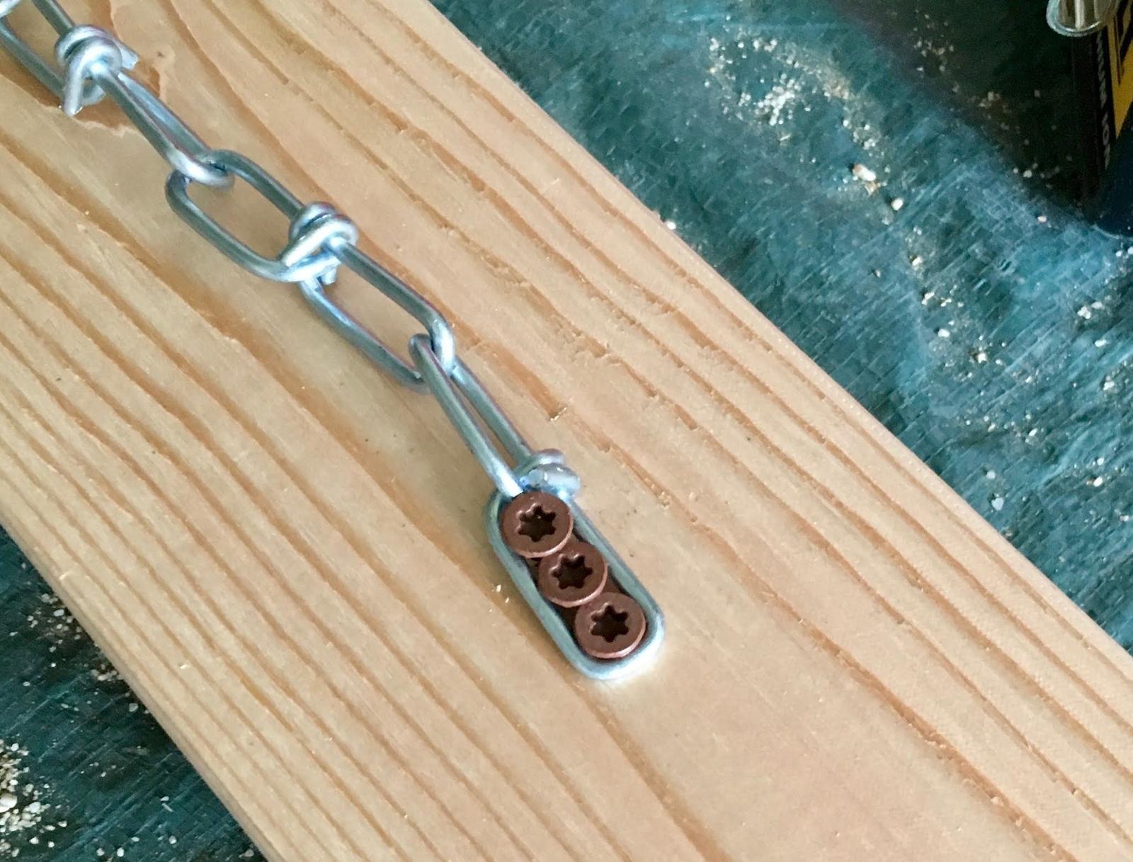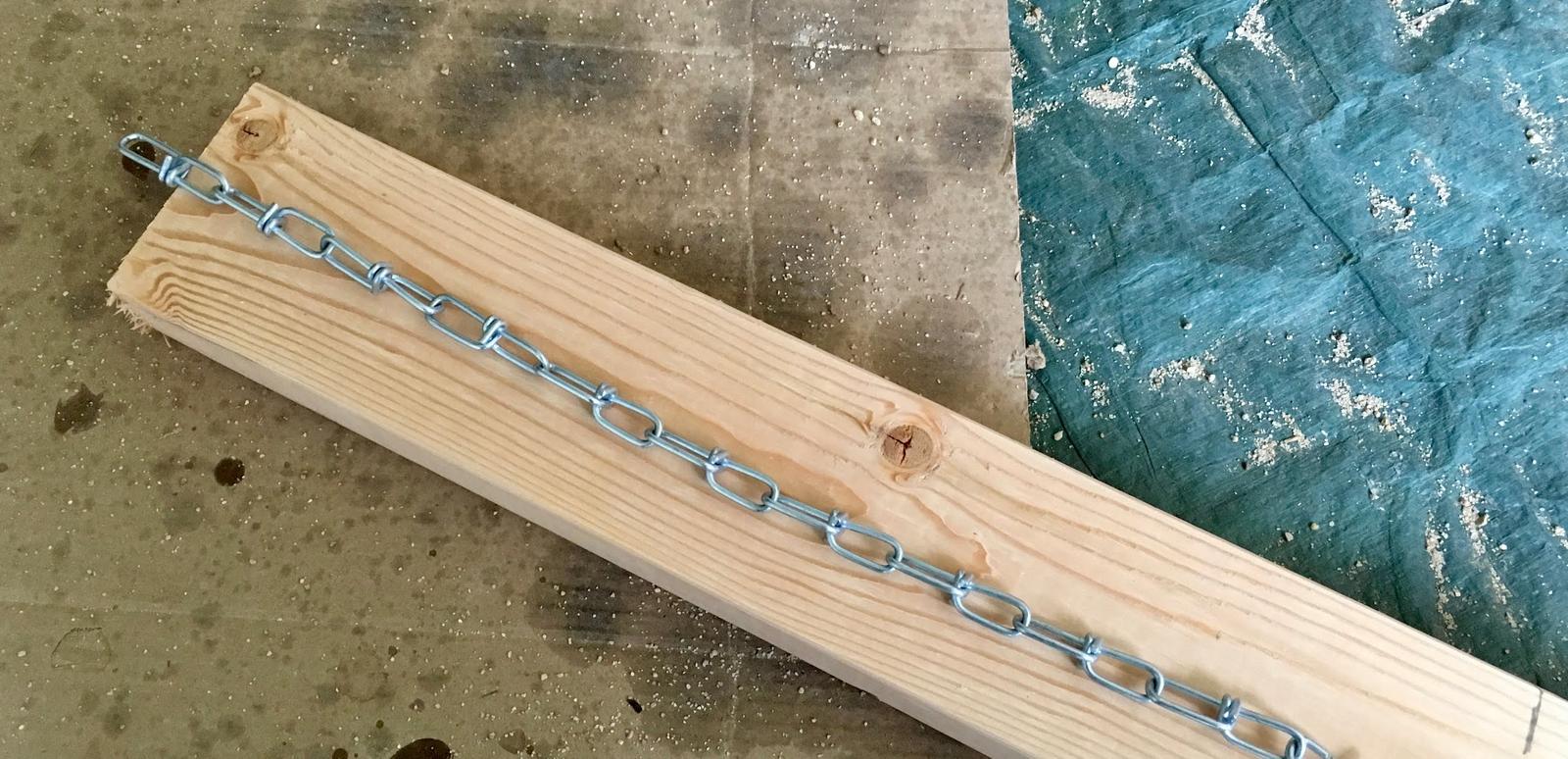 Once the shelves are built, it’s time to hang them. This requires the rear supports, the chain, and some hooks or latches.