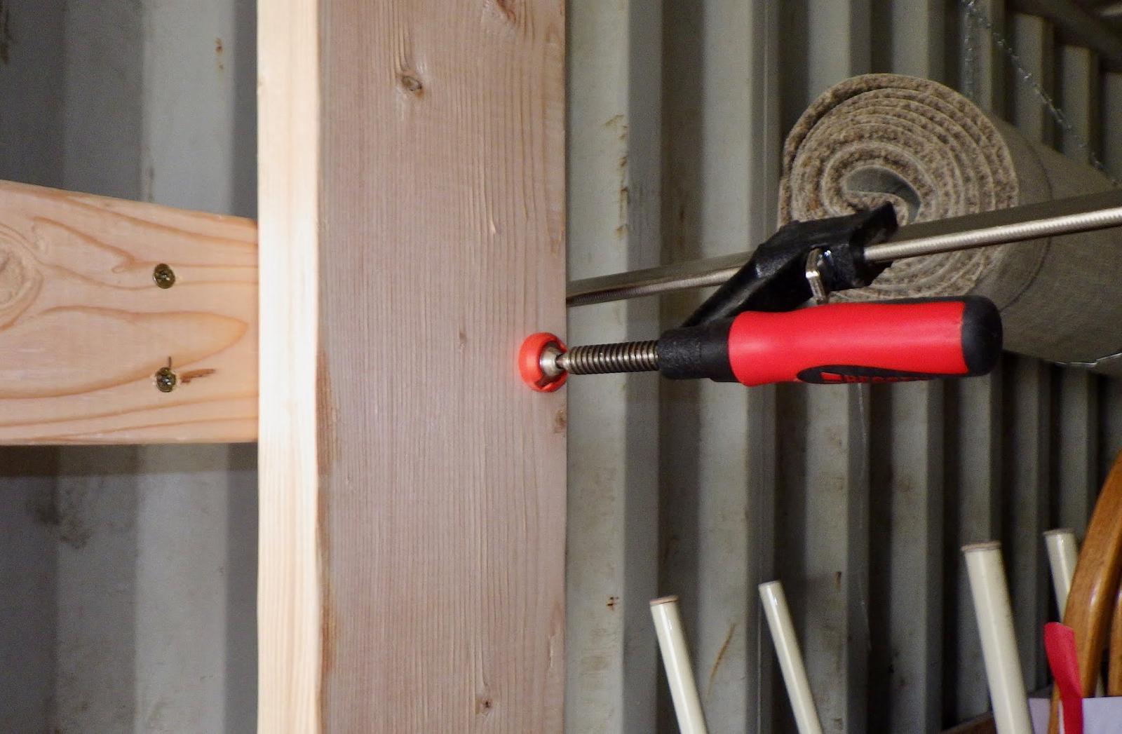 One of my goals for anything I build in the shipping container is that it shouldn’t require punching holes in the walls. No good comes of putting holes in a perfectly good shipping container wall. Even if you have the sealing washers, they’ll leak (eventually). Plus, actually getting something to bite into the metal is difficult (though hardened self tapping metal screws will eventually do it, at least for the corner pillars).