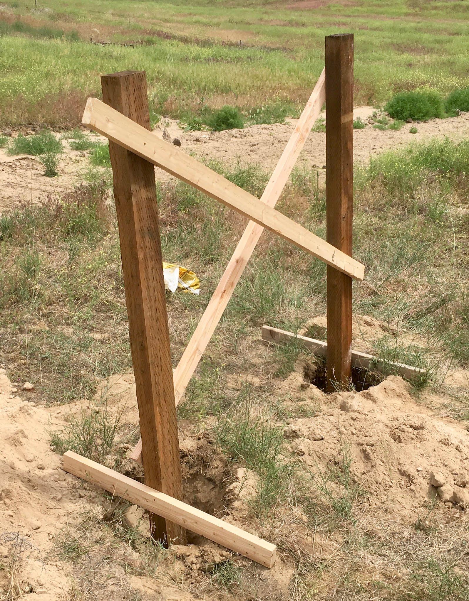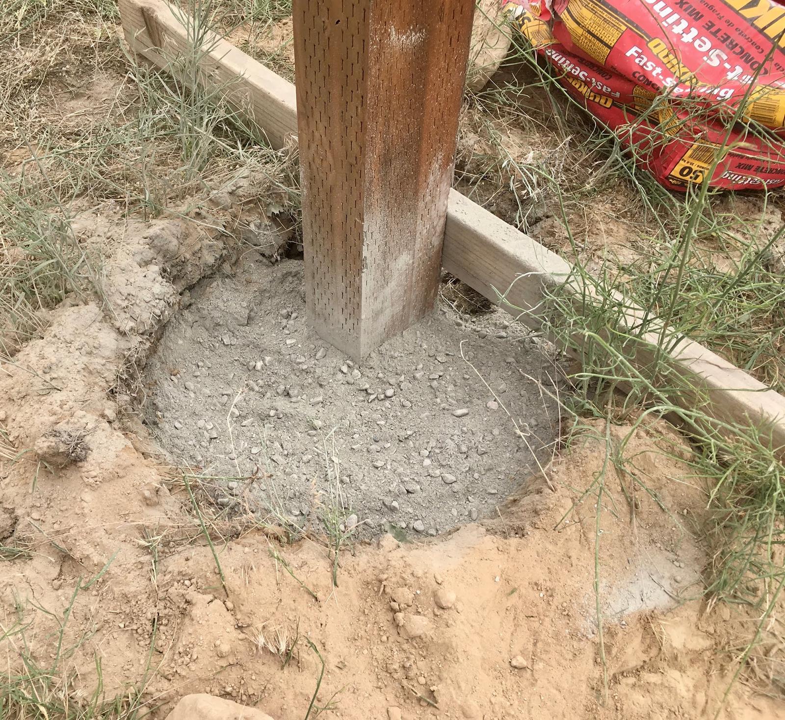 Since this frame won’t be taking much in the way of bending loads and generally won’t be heavily loaded, I went with Quickrete’s “fast setting” cement mix. No mixing! Just pour the dry mix in the hole and add a gallon of water per bag. The water percolates down through and somehow gets everything sorted out. I expect the mix pulls moisture from the soil as well over time. However it works, it seems to work well - the posts are very firmly fixed in the ground.