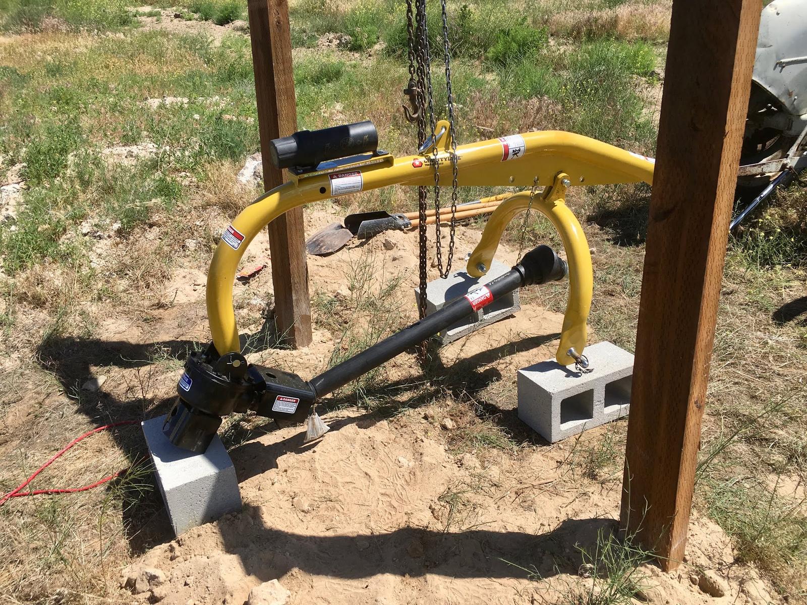 Wrap a bit of chain around the top, attach a chain hoist, and you’ve got a handy little lifting point for the post hole digger. Lifting the center of the digger makes mounting it a whole lot easier. The hole on the A-frame is about the center of balance without an auger attached.