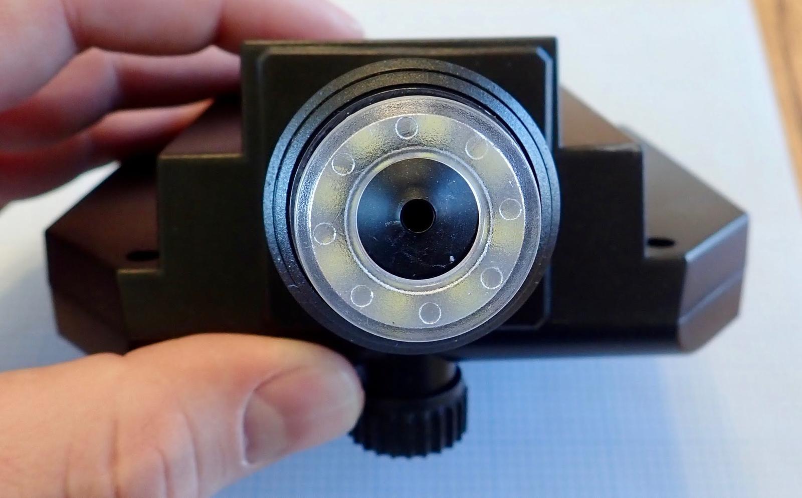 Moving to the business end, there’s a cone with a small opening for the image sensor, and a rather bright LED surround ring with a rough plastic diffuser on top. Point this at your target of interest, adjust focus, and go. Point-n-shoot operation, really.