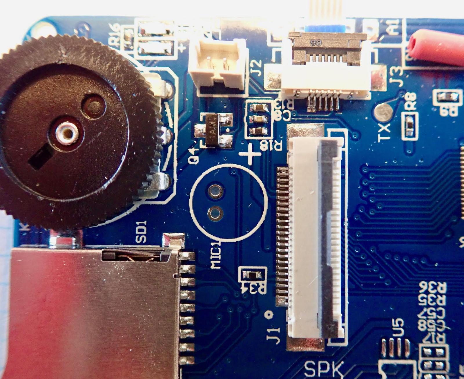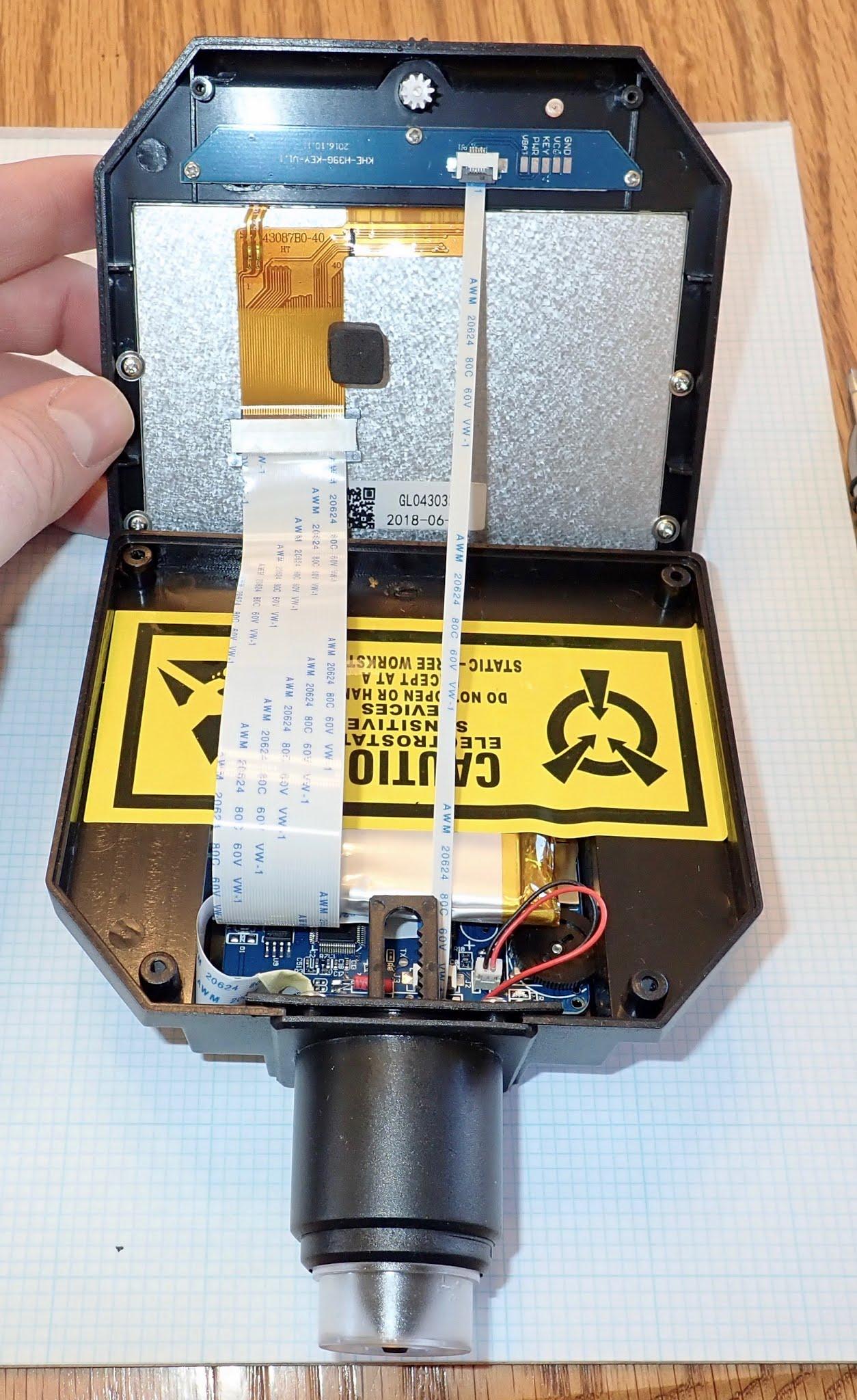 There’s nothing too fancy here. The USB port is on the left side along with the microSD card slot and the brightness adjustment. The two pin connector to the right of the dial is for the LED ring, the top ribbon cable is the keyboard, the center ribbon cable is for the camera, and the bottom ribbon cable is for the display.