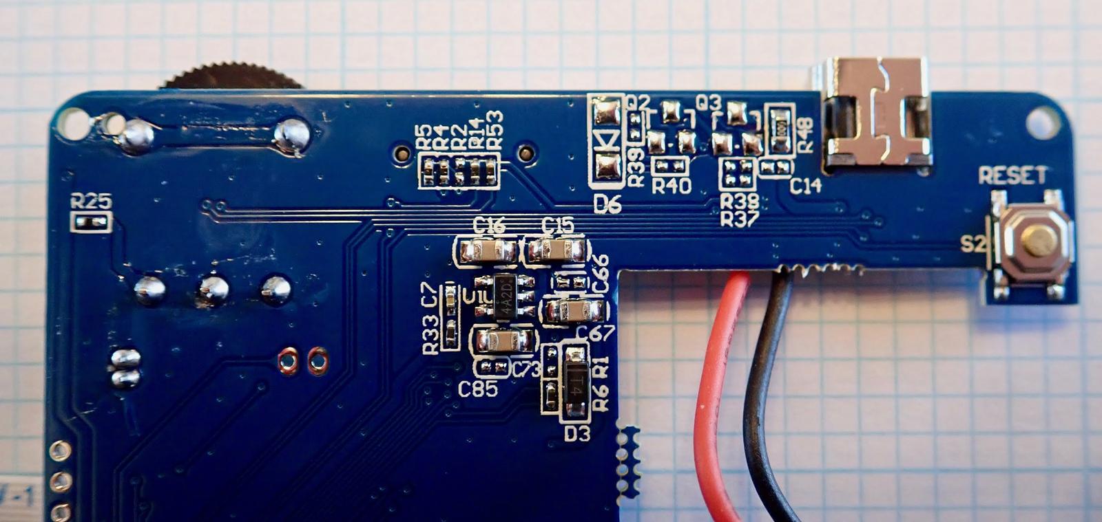 The back of the board has nothing interesting except around the USB port, where there are quite a few more missing component spots - missing a diodes, some transistors, a few resistors…
