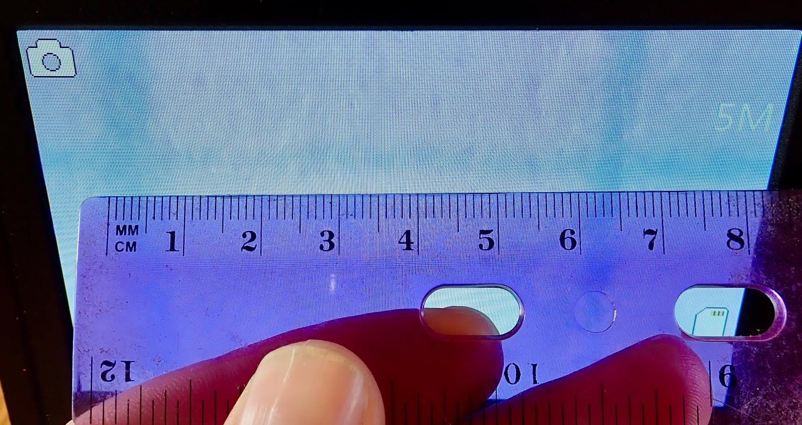 Zoomed in as tight as I can keep it focused, what’s the spacing on screen? A ruler and some estimation gives an edge-to-edge spacing of about 62mm.