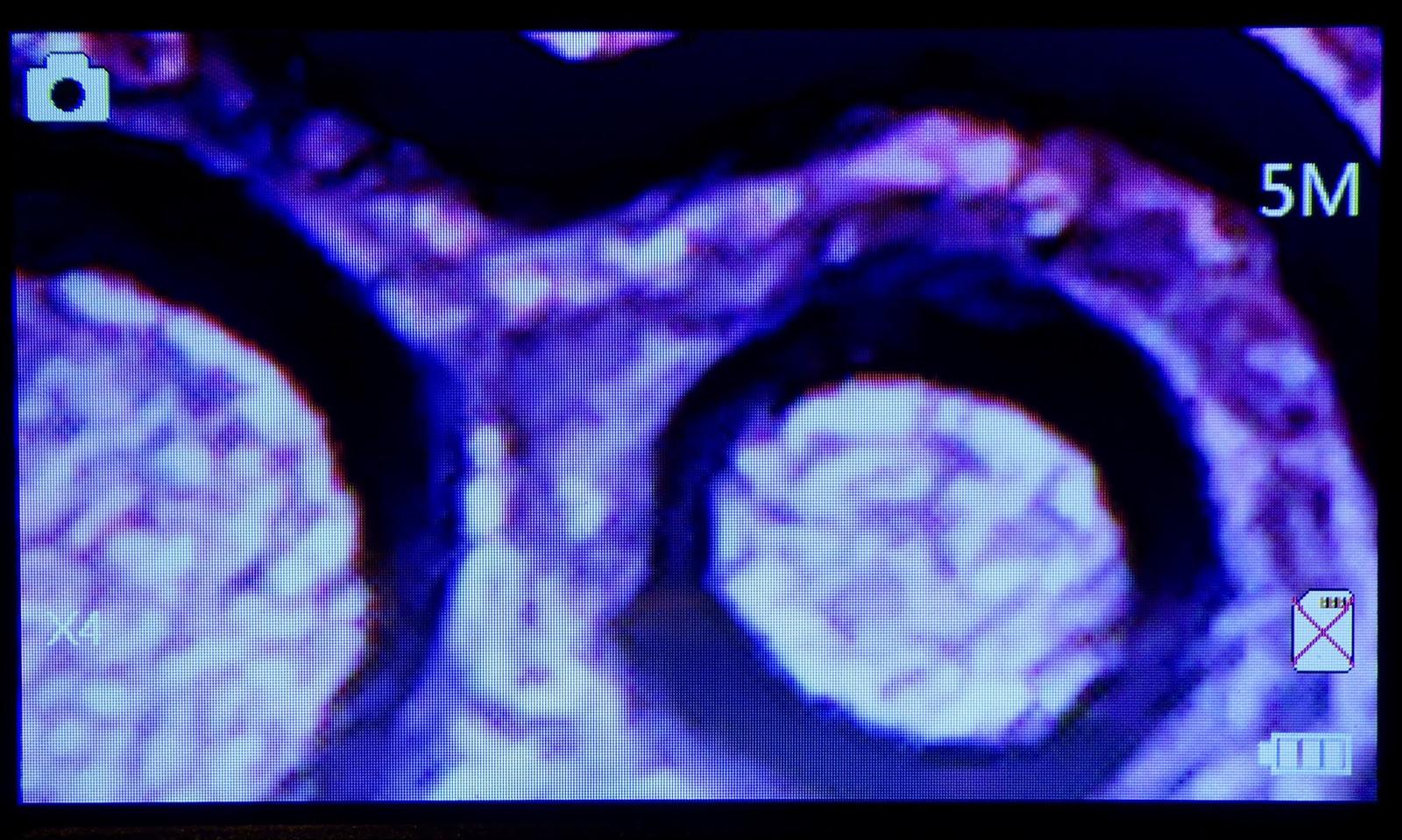 The two arrow buttons are useful for navigating the menu - but they also have an extra feature. In the photo or video modes, they’re digital zoom controls. You can select a 2x and 4x digital zoom on top of the normal image, which might be handy for tight work (though the image quality drops quickly as one might expect here). It looks like it’s doing some sort of smoothing on the image for the digital zoom levels, so it’s not quite as bad as one might fear.