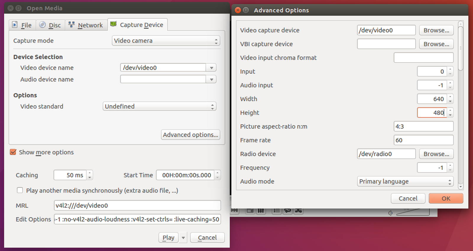 With VLC on Linux, you’ll want to select /dev/video0 as the device (assuming it’s the only camera attached to the Linux box), then under Advanced options, manually set the resolution to 640x480. You can also drop the caching time - the default is 300ms, which leads to a noticeable lag. Drop it down (it gets a tiny bit weird at 0ms but eventually works out details) for a more responsive device. It should work!
