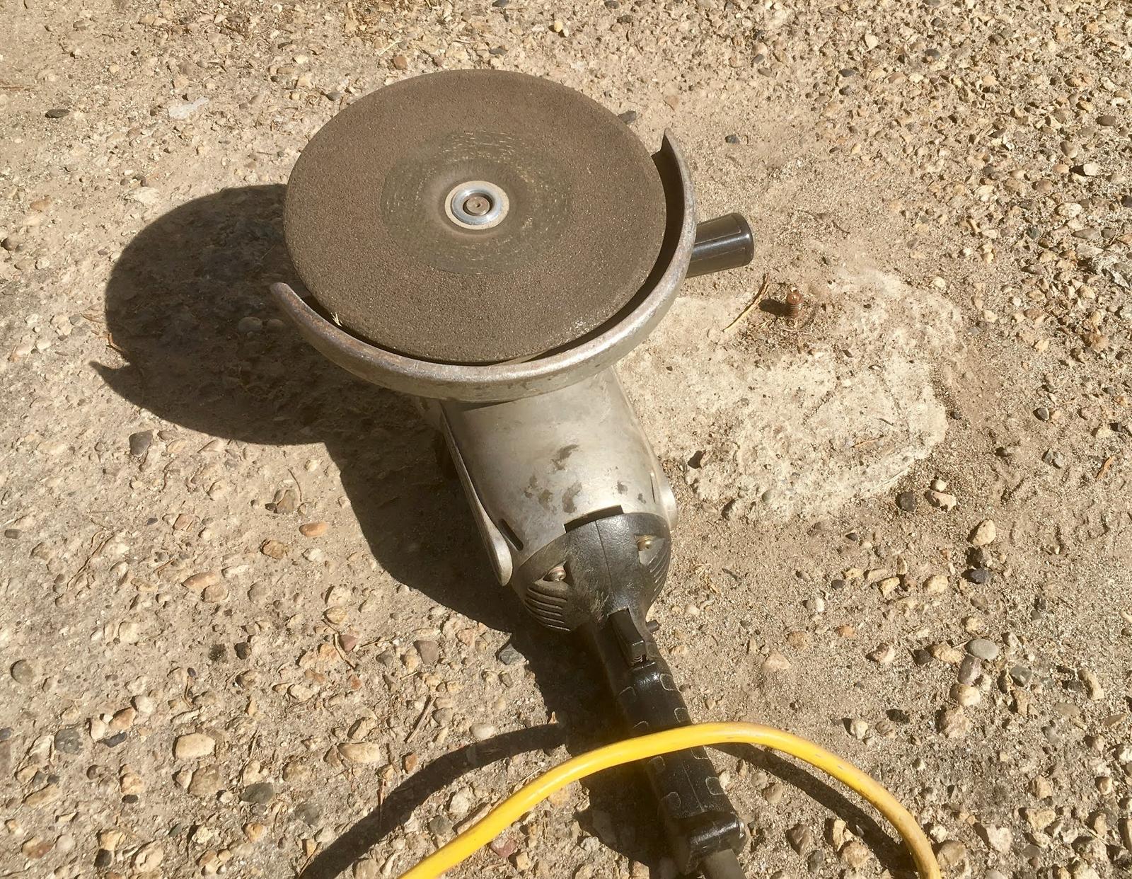 How do you resolve bolt heads sticking out of the ground? With a grinder! I borrowed this bit of 1970s technology from a neighbor up the hill. It’s big, loud, insanely powerful, a bit of a nightmare to use compared to modern ones (I found out after I returned it that the trigger had been sticking for a while, though it behaved for me), and works perfectly to grind bolt heads off flush with the concrete.