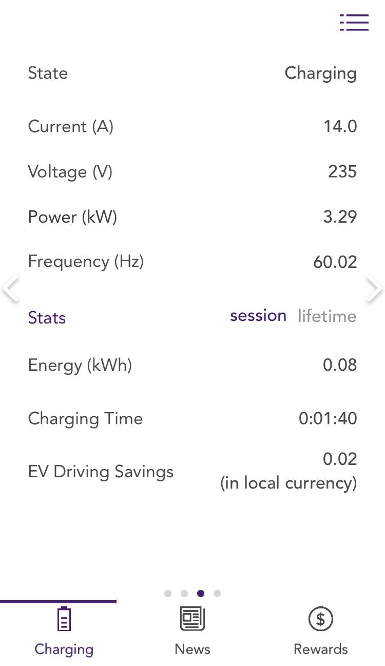 With the JuiceBox app, I can see more or less realtime data from the charger. How fast am I charging? The app tells me, helpfully, that I’m charging at 3.29kW - which, for a 3.3kW charger on the car, sounds about right! Voltage drop is maybe a bit more than I’d like (235V at the EVSE), which is about 2% from a nominal 240V. However, voltage was a bit low even while not charging, so it’s not an issue with the install.