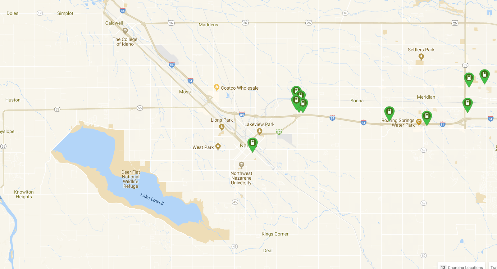 See the lone charger in Nampa, southwest from the cluster of car dealerships up by the highway? That’s mine - and, importantly, it’s near downtown.