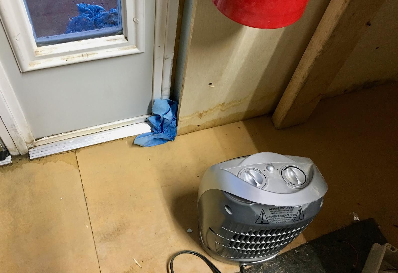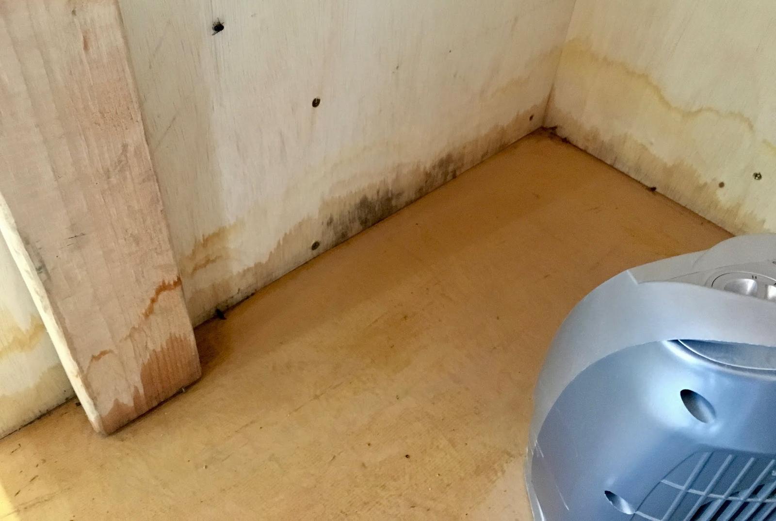 My little heater is running in the corner trying to dry stuff out. It’s pretty good at it, both moving and heating air, but it couldn’t keep up with the rain. You can see the “high water marks” where water has been in the past. Those aren’t standing water levels - the water just wicks up the plywood.