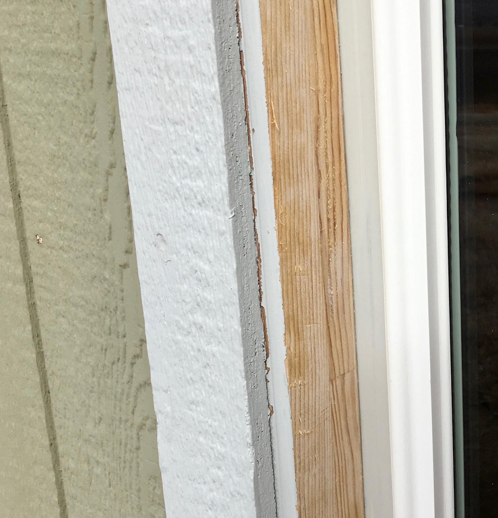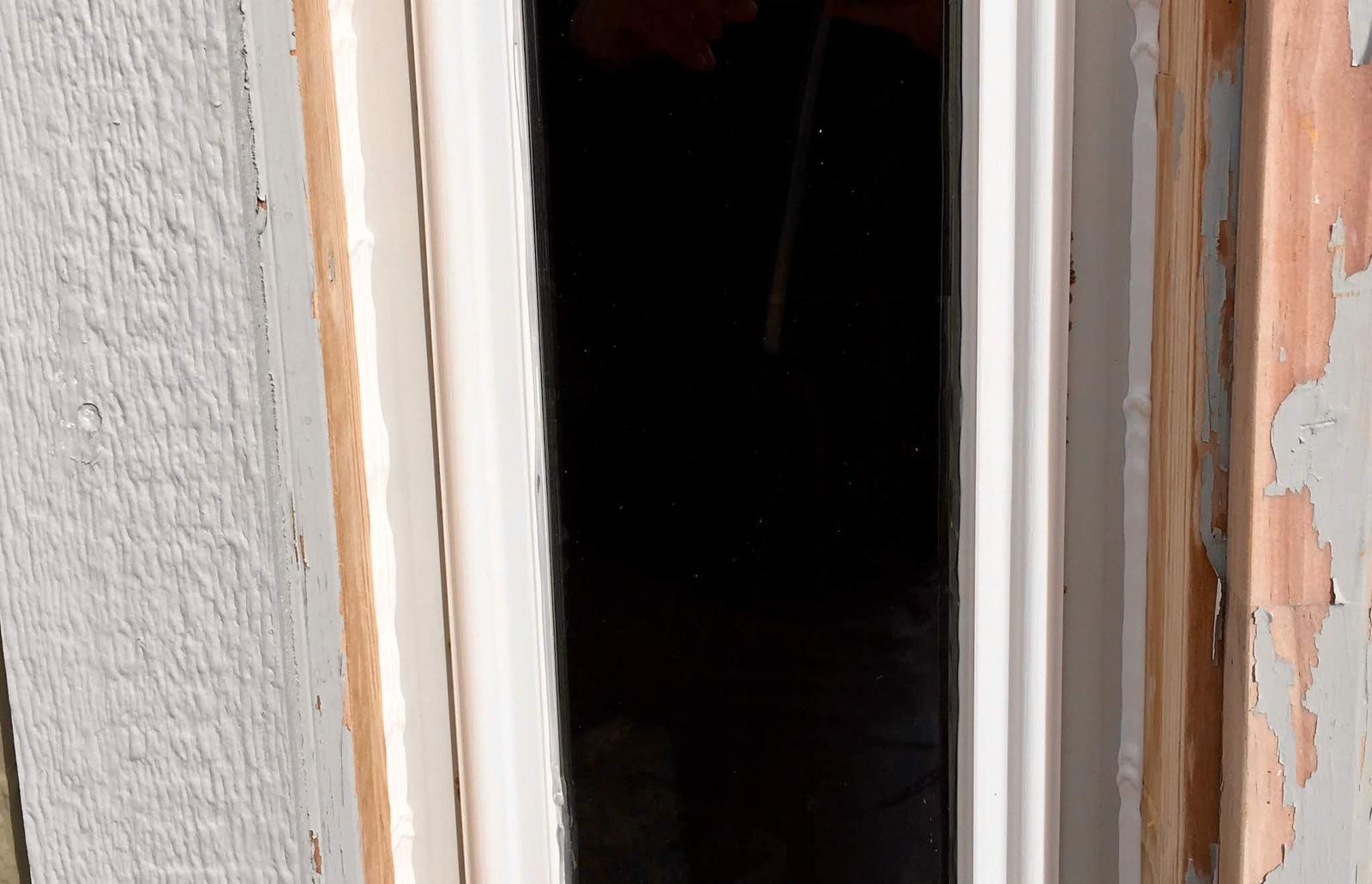 With the paint removed, I set out to caulk up everything. We’ll not discuss some of my early efforts, other than to note that if you haven’t done much caulking, maybe go find something else to practice on first. The windows are done with a clear, flexible silicone caulk designed to bond to window glass. This covers rain running down along the window pane and through the trim work.