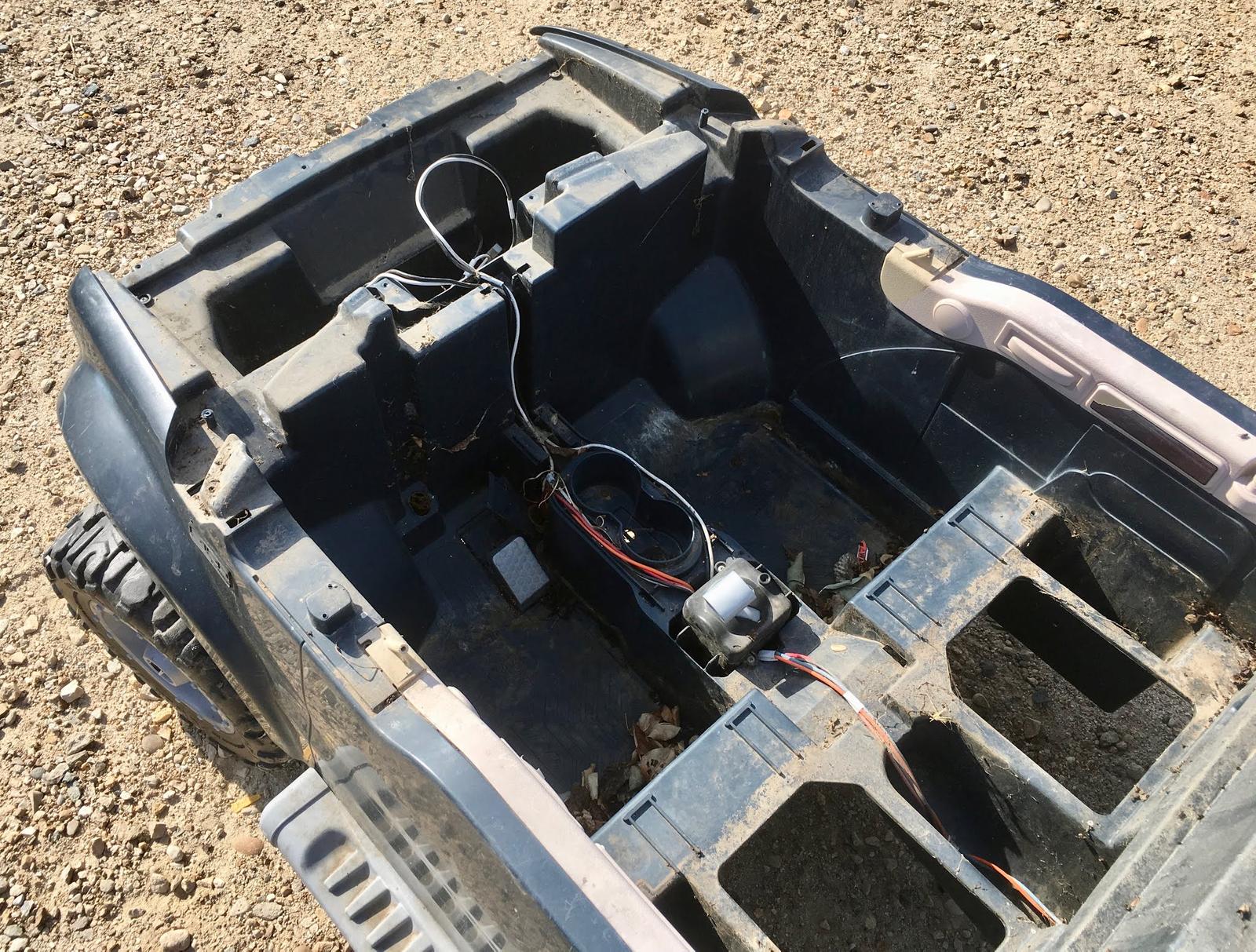 With the utter uselessness of a 1WD PowerWheels firmly in mind, I looked around on Craigslist and eBay for random 2WD PowerWheels vehicles, and couldn’t find any at a price I wanted to pay. Sure, I could spend $100 or $150 on a fully working one, but what’s the fun on that? I figured if I was patient, I’d find one for far less - and I was right! Eventually, while I was somewhere, I saw this one under a tree, filled with leaves, with a half broken bicycle in it. No battery, no battery connector, but it had two motors, and both rear wheels turned independently with reasonable noises - so the gearbox and motors were intact, and the motors were probably fine! $20 got me the PowerWheels and the bike, since they were just destined for a yard sale.