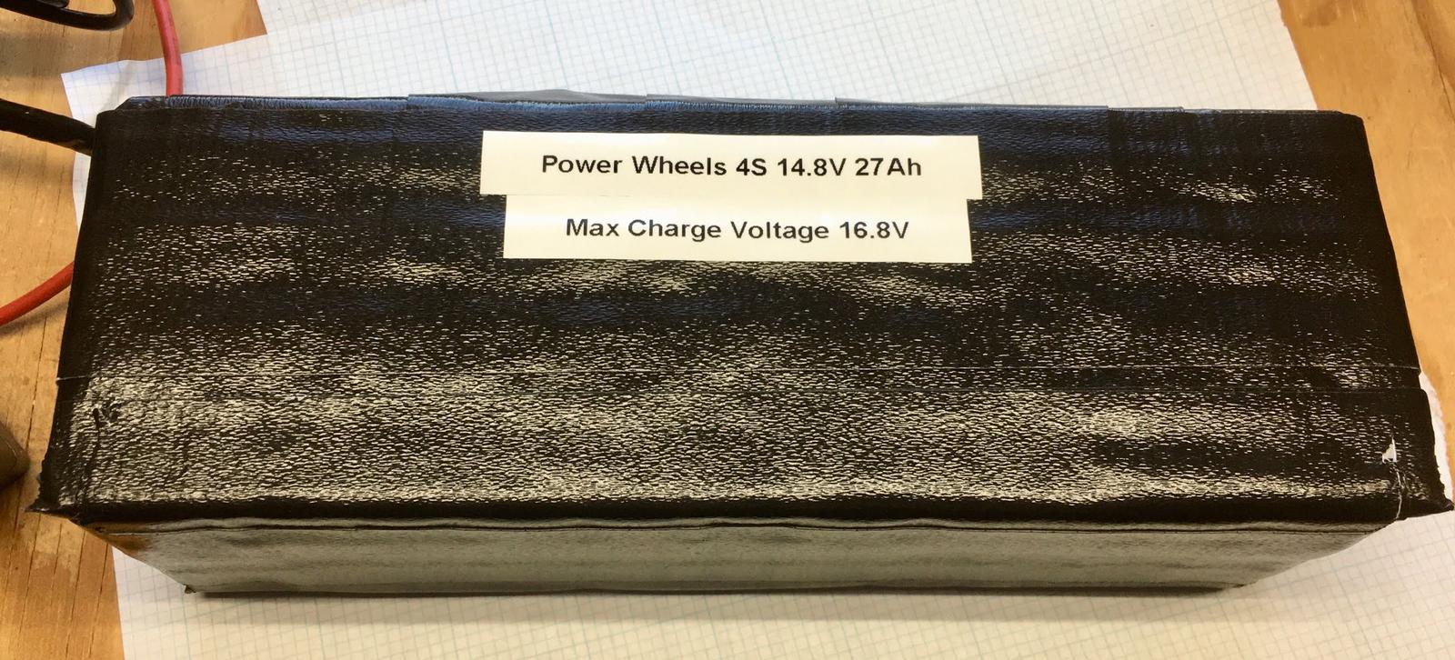 Quite a bit more soldering, wiring, and taping, I’ve got a pack! I expect this pack, with some reasonable care, to last the next decade or so - which gets me out of the younger kid fitting in the Power Wheels. It won’t be a full 27Ah in a decade, but based on my experience with BionX packs, I’d expect at least 22-23Ah out of it by then. Still quite useful!