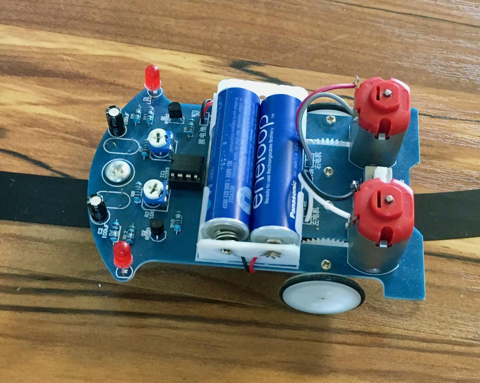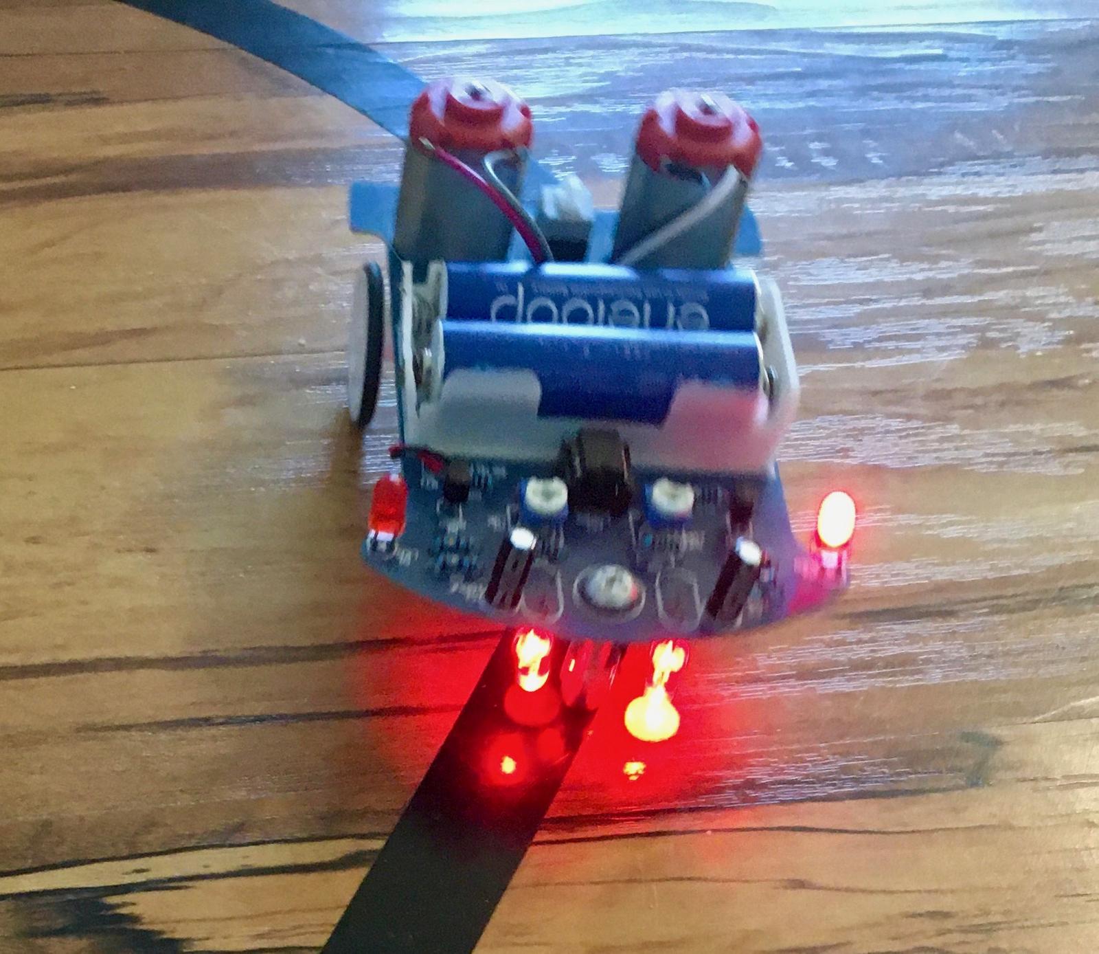 Another random winter evening project with my daughter involved a “D2-5 line following car.” You can get these kits for about $5 on eBay, and build them (with some basic through hole soldering) into a car that will chase a black line around on the floor! It’s a purely analog system involving LEDs, light sensors, and a comparator. The car tries to seek the black line by alternating which motors is running, and the net effect is a zig-zag dance around the tape path. It’s really quite cute.