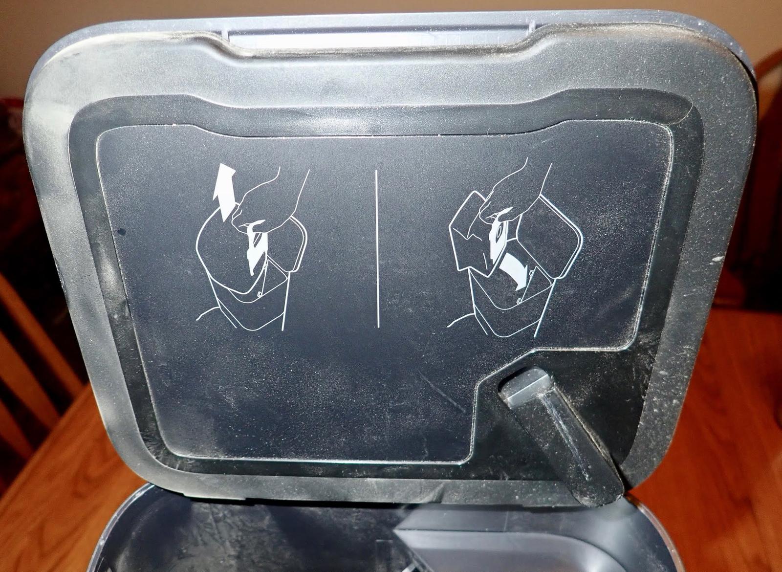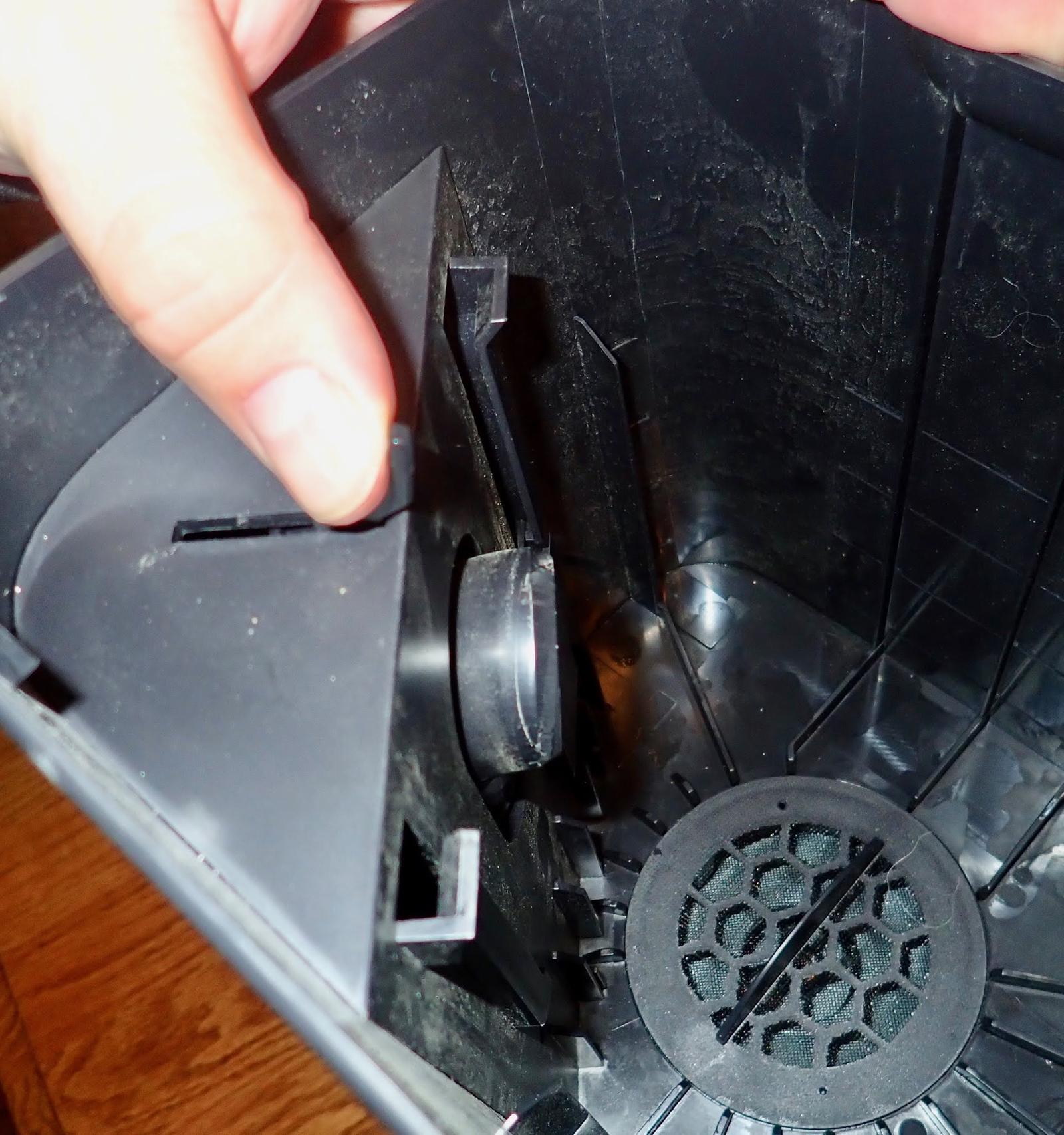 Working around the unit, the top of the vacuum bin comes off easily as well. It’s just a clip fit, so open it all the way and keep trying to open it - it’ll pop right off!