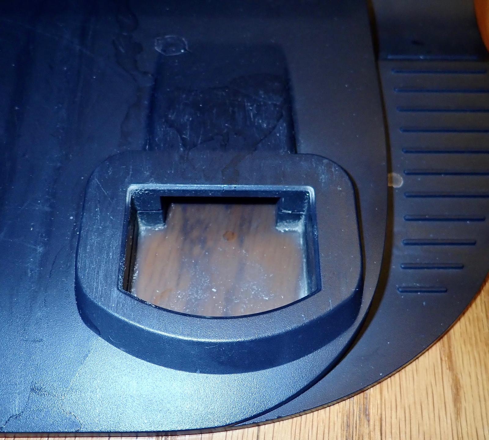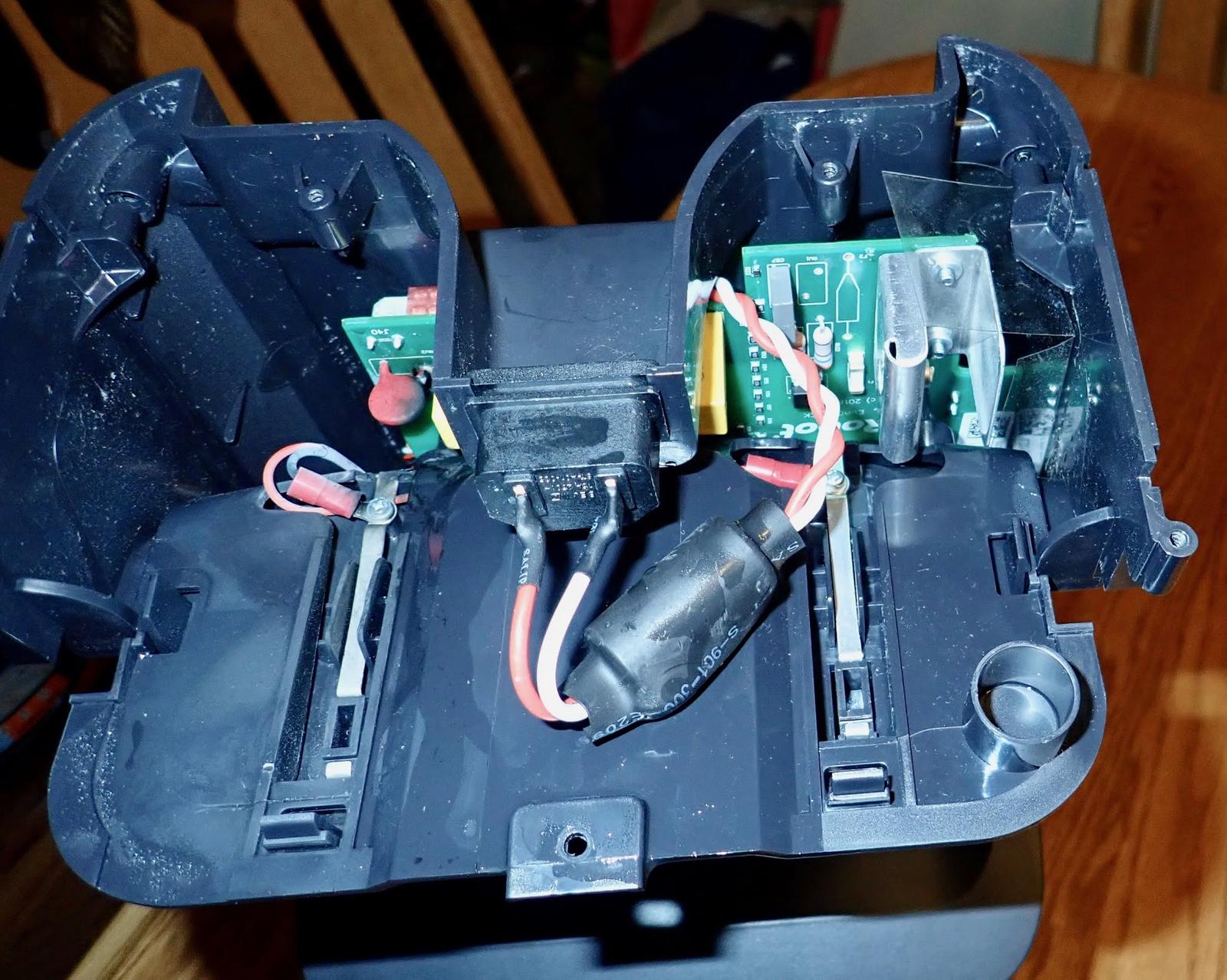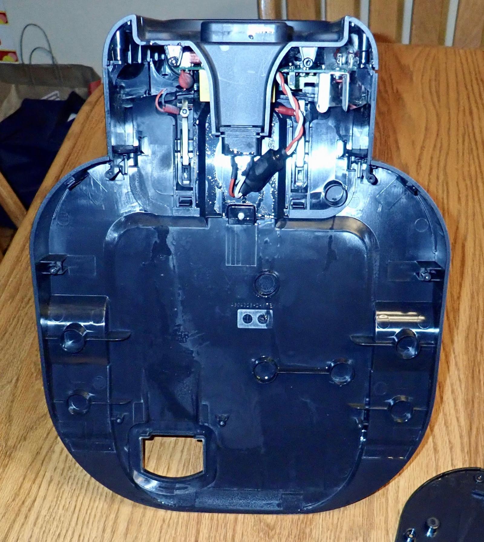 With the bottom removed, you can see the (fried) circuit board, as well as the metal prongs that contact the charging pads on the Roomba. For reasons I fail to understand, the Roomba manages to gunk up the charging pads on a regular basis. Cleaning those helps a ton when it can’t figure out how to charge. You can see how wet thing are down here. That’s why I’m doing this whole teardown.