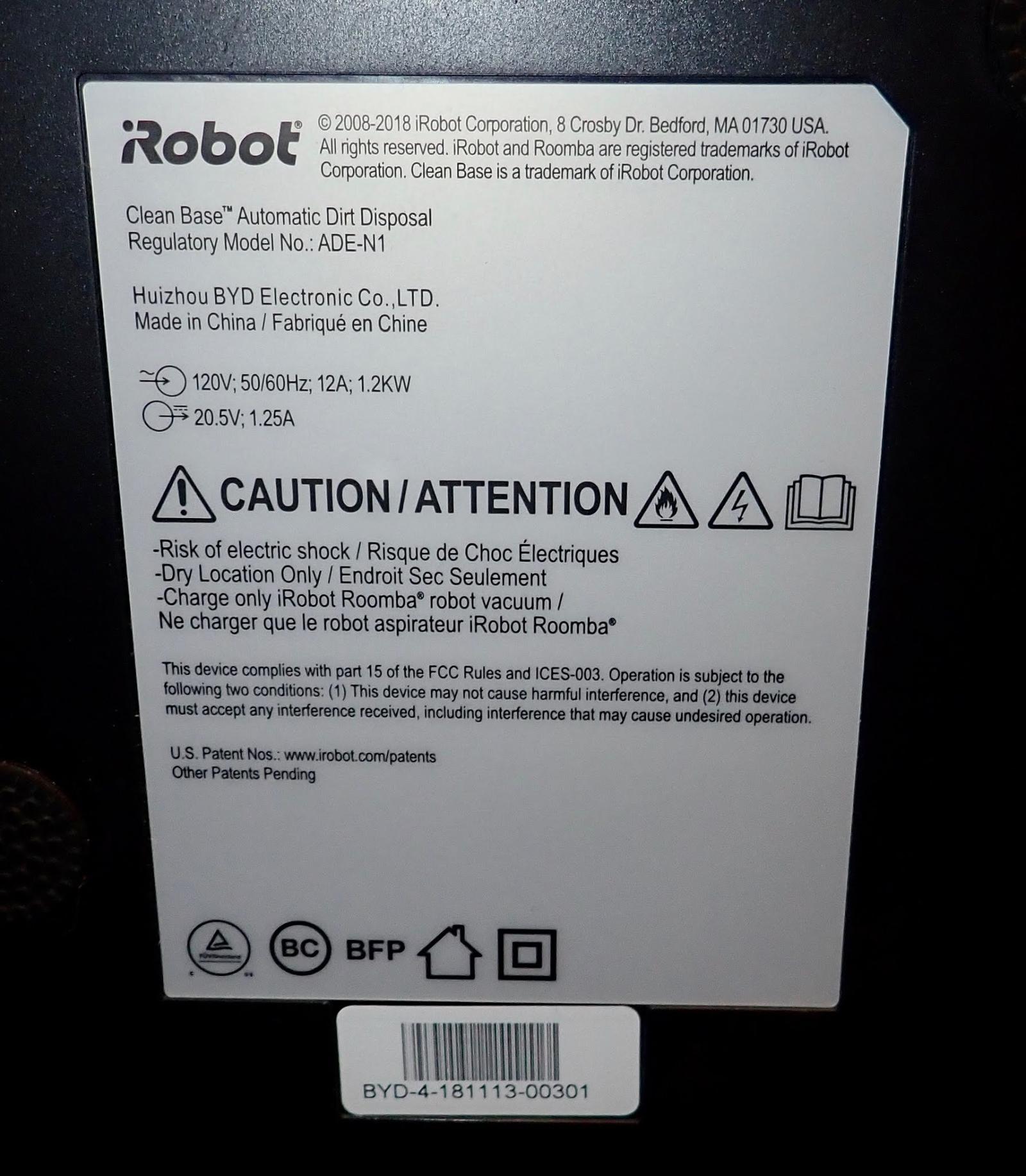 The product label has some interesting details. This is an ADE-N1, don’t get it wet (duh), and a power rating that makes no sense. 120V @ 12A is 1440W, not 1200W. I don’t actually know what it pulls (since it’s now rather broken), but somewhere in the 10-12A range. Output voltage for the Roomba is 20.5V (a pretty standard laptop charging voltage), for a total charge power of about 26W.